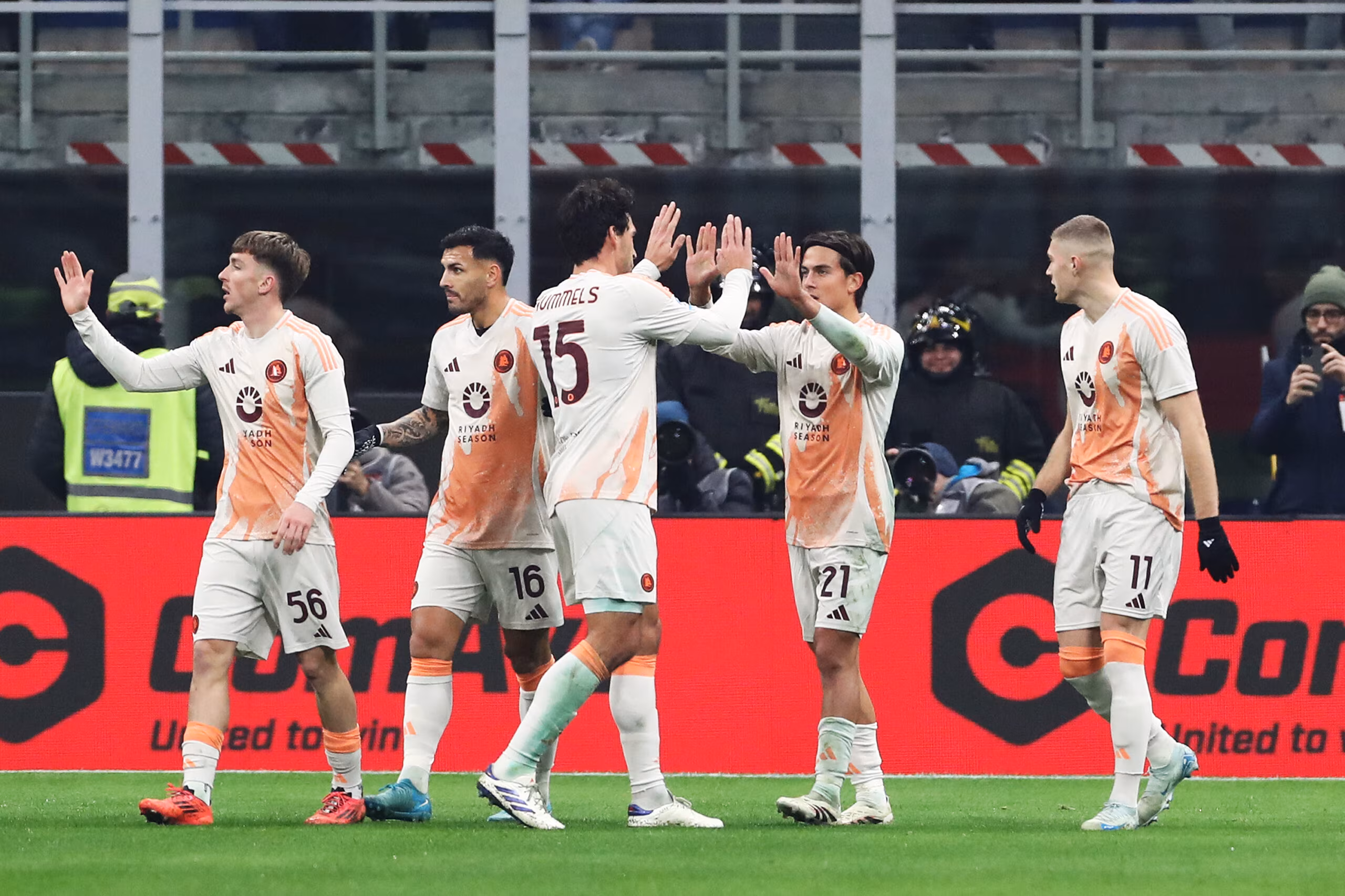 MILAN, ITALY - DECEMBER 29: Paulo Dybala of AS Roma celebrates scoring his team's first goal with teammates during the Serie A match between AC Milan and AS Roma at Stadio Giuseppe Meazza on December 29, 2024 in Milan, Italy. (Photo by Marco Luzzani/Getty Images)