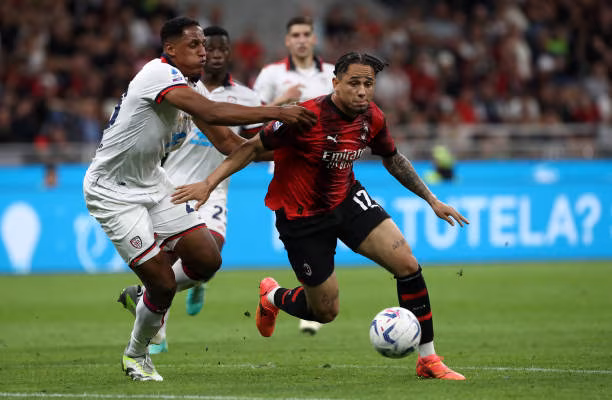 MILAN, ITALY - MAY 11: Noah Okafor of AC Milan (R) and Yerry Mina of Cagliari Calcio battle for the ball during the Serie A TIM match between AC Milan and Cagliari at Stadio Giuseppe Meazza on May 11, 2024 in Milan, Italy. (Photo by Marco Luzzani/Getty Images)