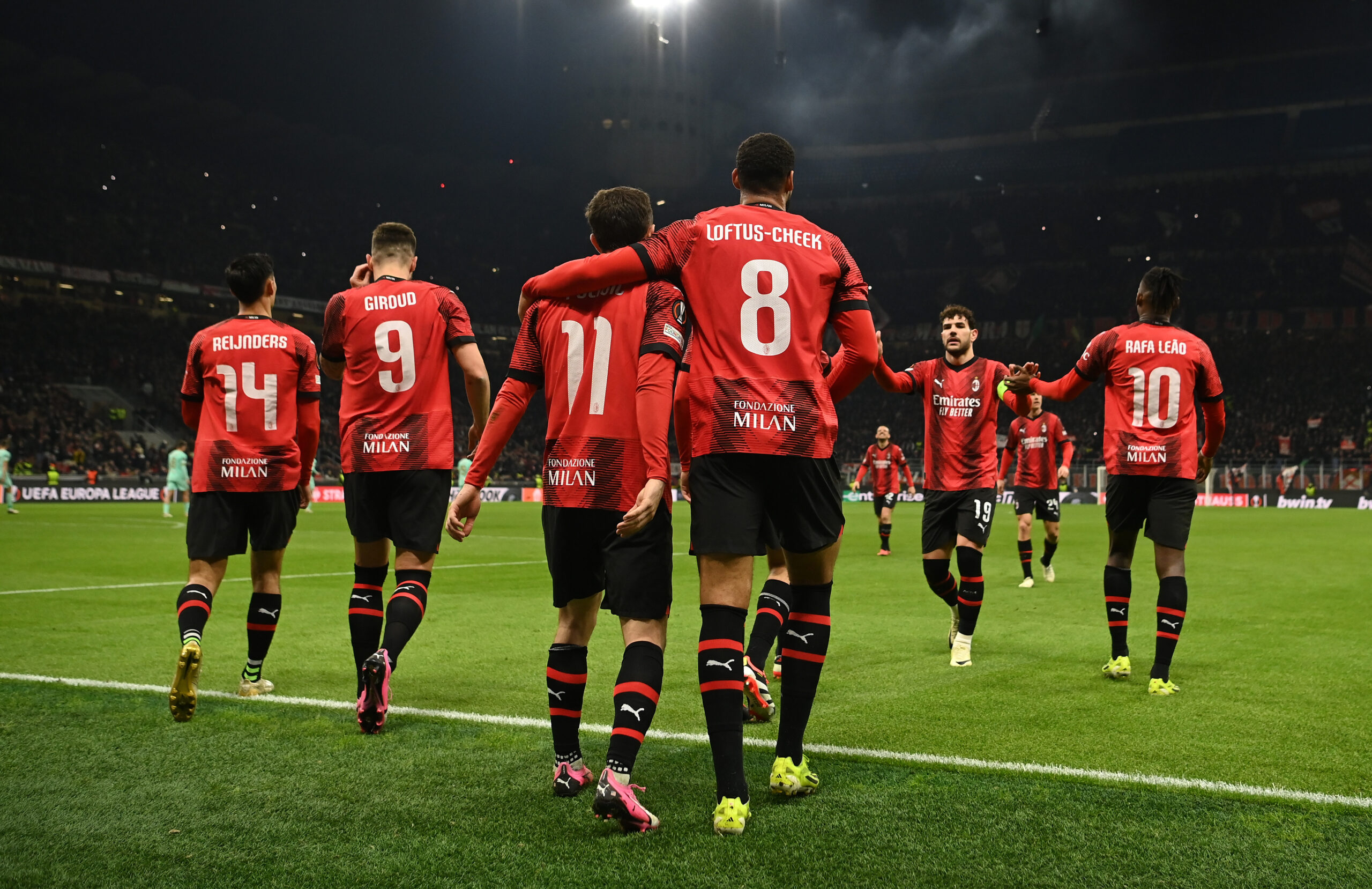 MILAN, ITALY - MARCH 07: Ruben Loftus Cheek of AC Milan celebrates with team-mates after scoring the goal during the UEFA Europa League 2023/24 round of 16 first leg match between AC Milan and Slavia Praha at Stadio Giuseppe Meazza on March 07, 2024 in Milan, Italy. (Photo by Claudio Villa/AC Milan via Getty Images) (Photo by Claudio Villa/AC Milan via Getty Images)
