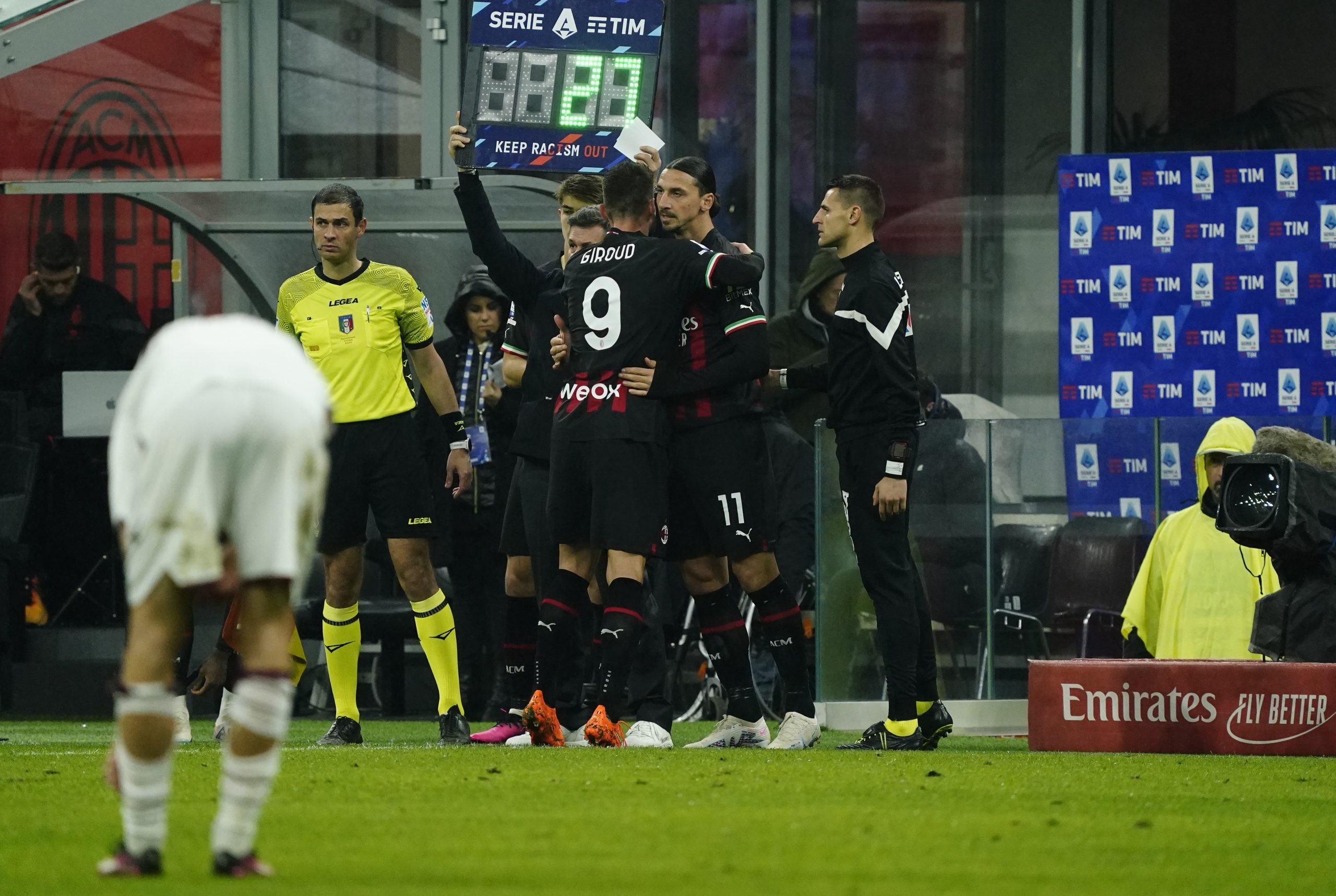 MILAN, ITALY - MARCH 13: Olivier Giroud of AC Milan hugs Zlatan Ibrahimović of AC Milan before leaving the field during the Serie A match between AC MIlan and Salernitana at Stadio Giuseppe Meazza on March 13, 2023 in Milan. (Photo by Pier Marco Tacca/AC Milan via Getty Images)