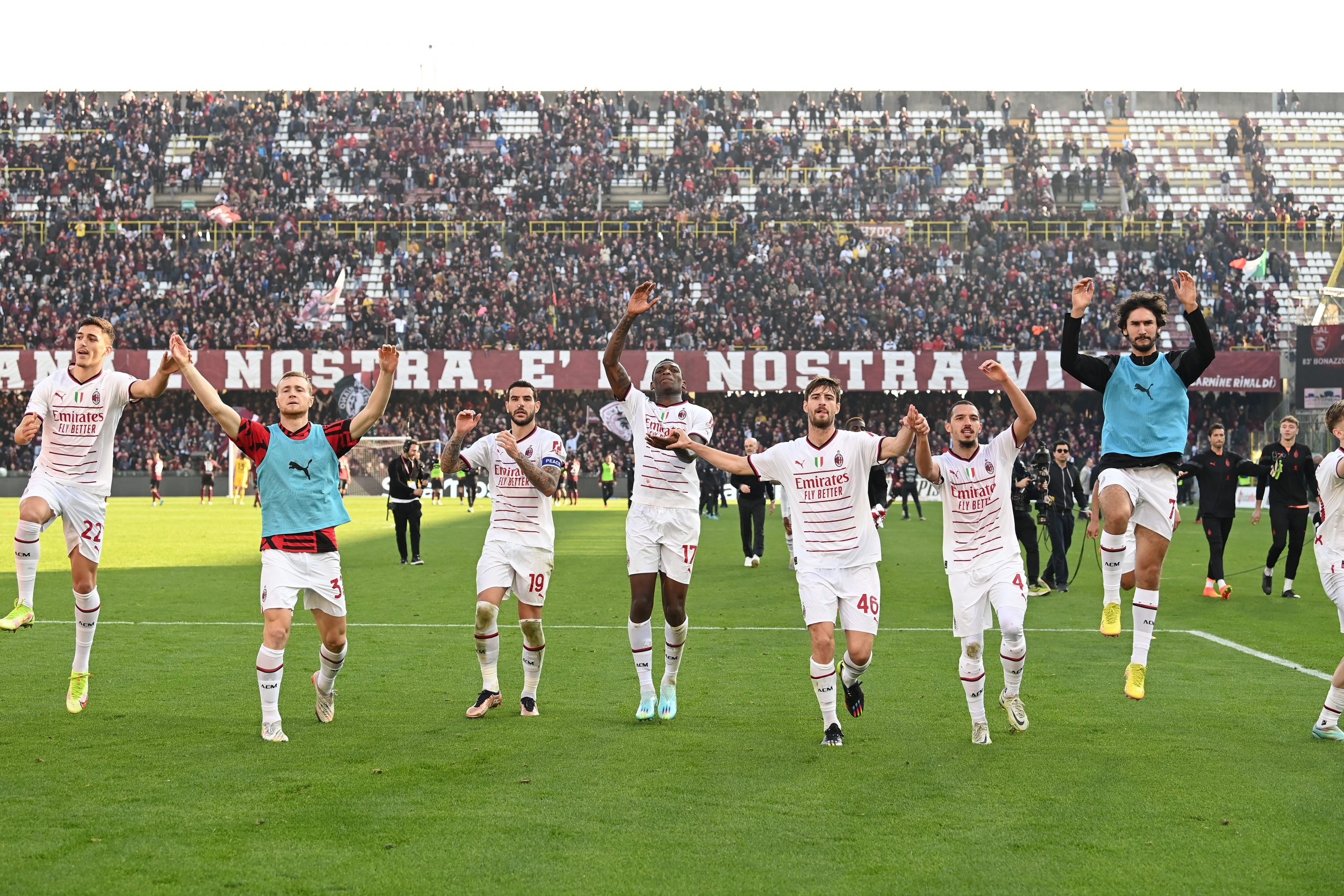 SALERNO, ITALY - JANUARY 04: Players of AC Milan celebrate the win at the end of the Serie A match between Salernitana and AC MIlan at Stadio Arechi on January 04, 2023 in Salerno, Italy. (Photo by Claudio Villa/AC Milan via Getty Images)