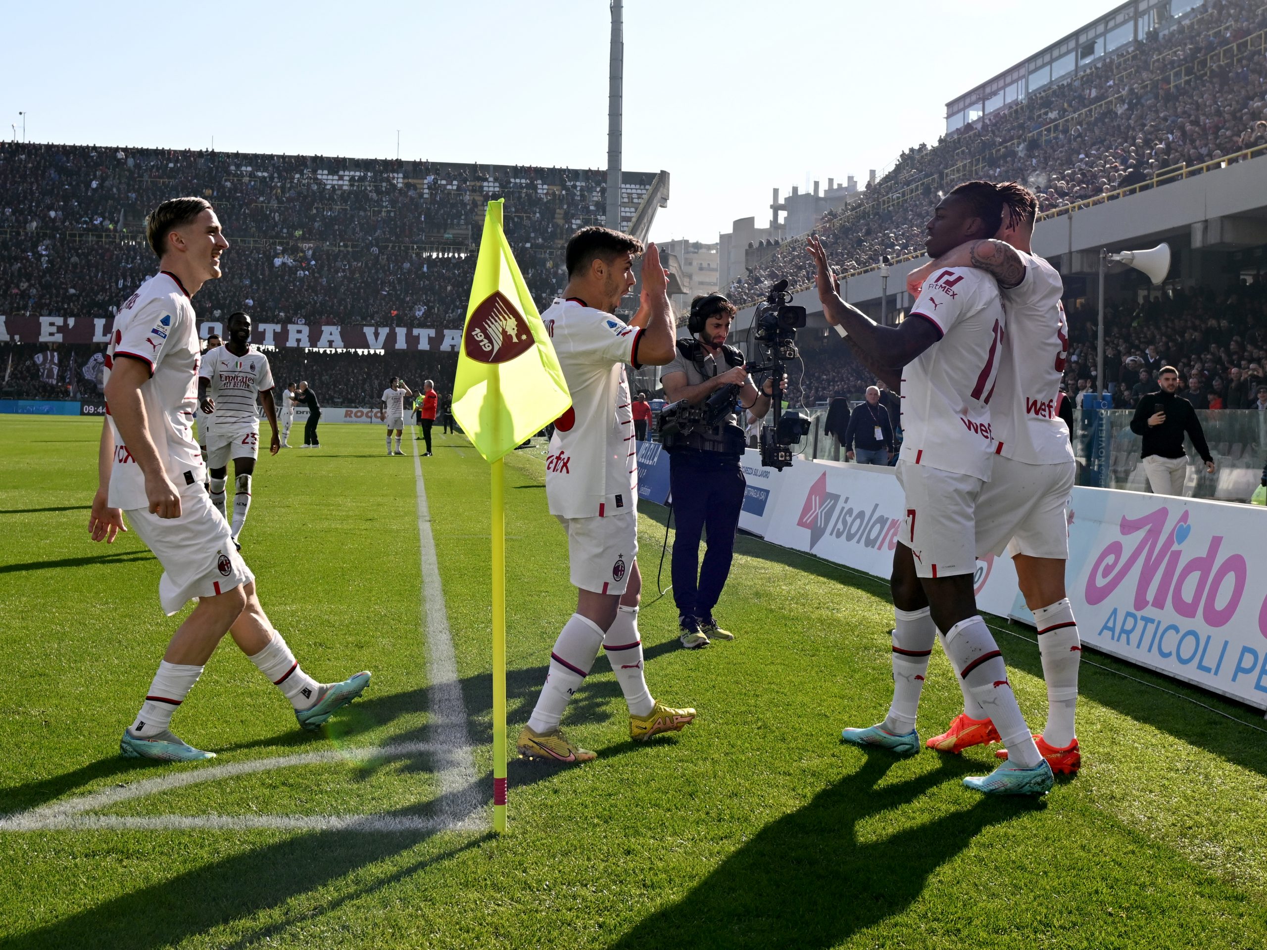 SALERNO, ITALY - JANUARY 04: Rafael Leao, Olivier Giroud and Brahim Diaz of AC Milan celebrate after the opening goal during the Serie A match between Salernitana and AC MIlan at Stadio Arechi on January 04, 2023 in Salerno, Italy. (Photo by Claudio Villa/AC Milan via Getty Images)