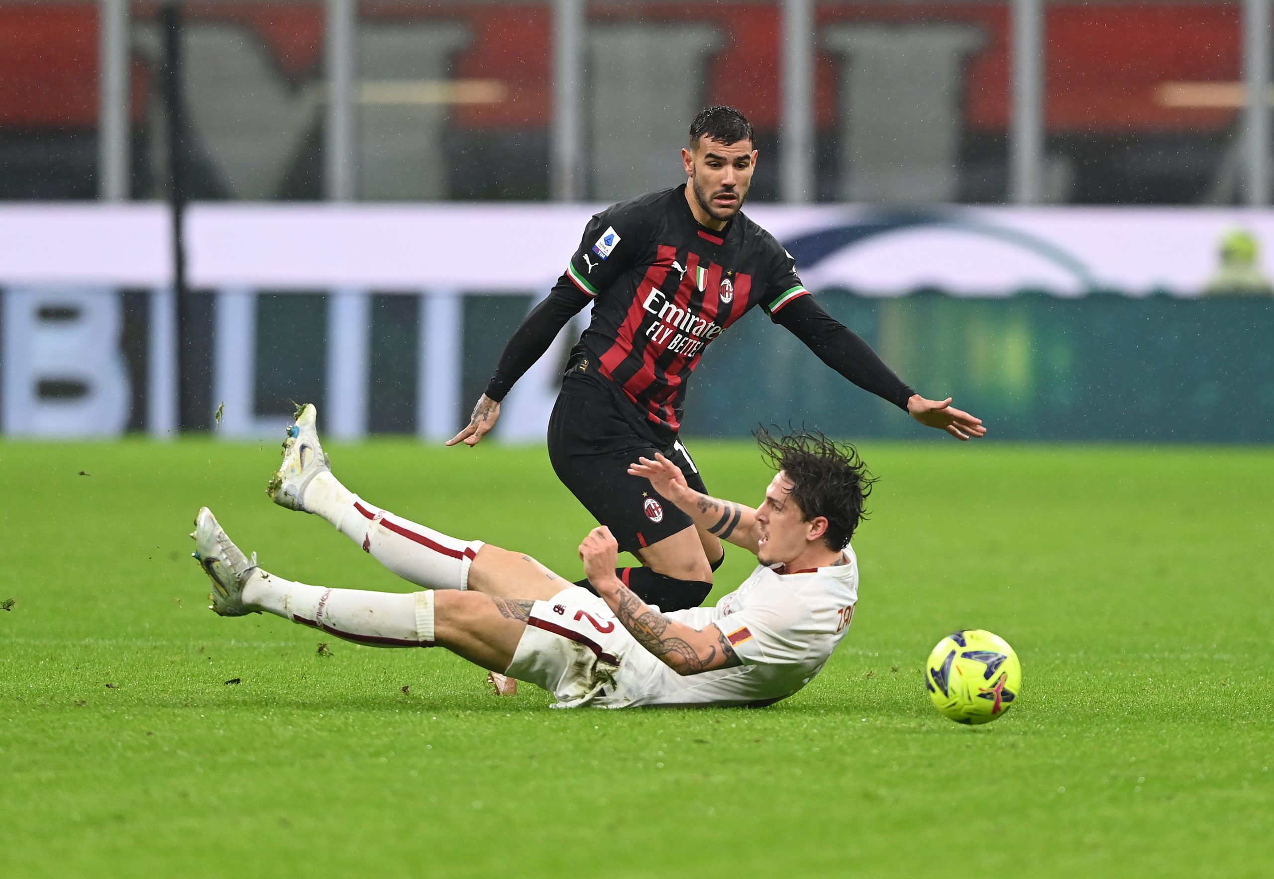 MILAN, ITALY - JANUARY 08: Theo Hernandez of AC Milan competes for the ball with Nicolo Zaniolo of AS Roma during the Serie A match between AC MIlan and AS Roma at Stadio Giuseppe Meazza on January 08, 2023 in Milan, Italy. (Photo by Claudio Villa/AC Milan via Getty Images)