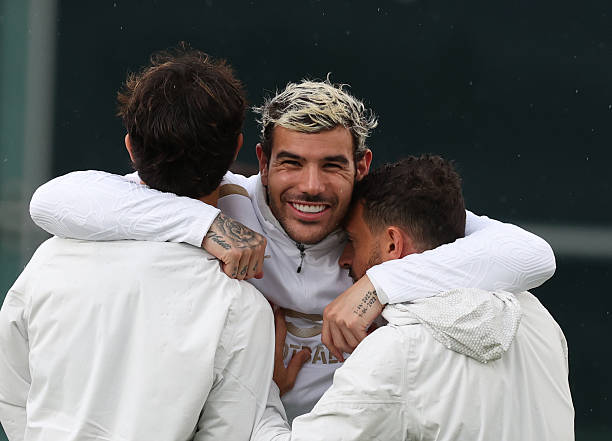 ROME, ITALY - MAY 13: Joao Felix, Theo Hernandez and Alessandro Florenzi of AC Milan react during AC Milan training session at Centro Sportivo Giulio Onesti on May 13, 2025 in Rome, Italy. (Photo by Claudio Villa/AC Milan via Getty Images)