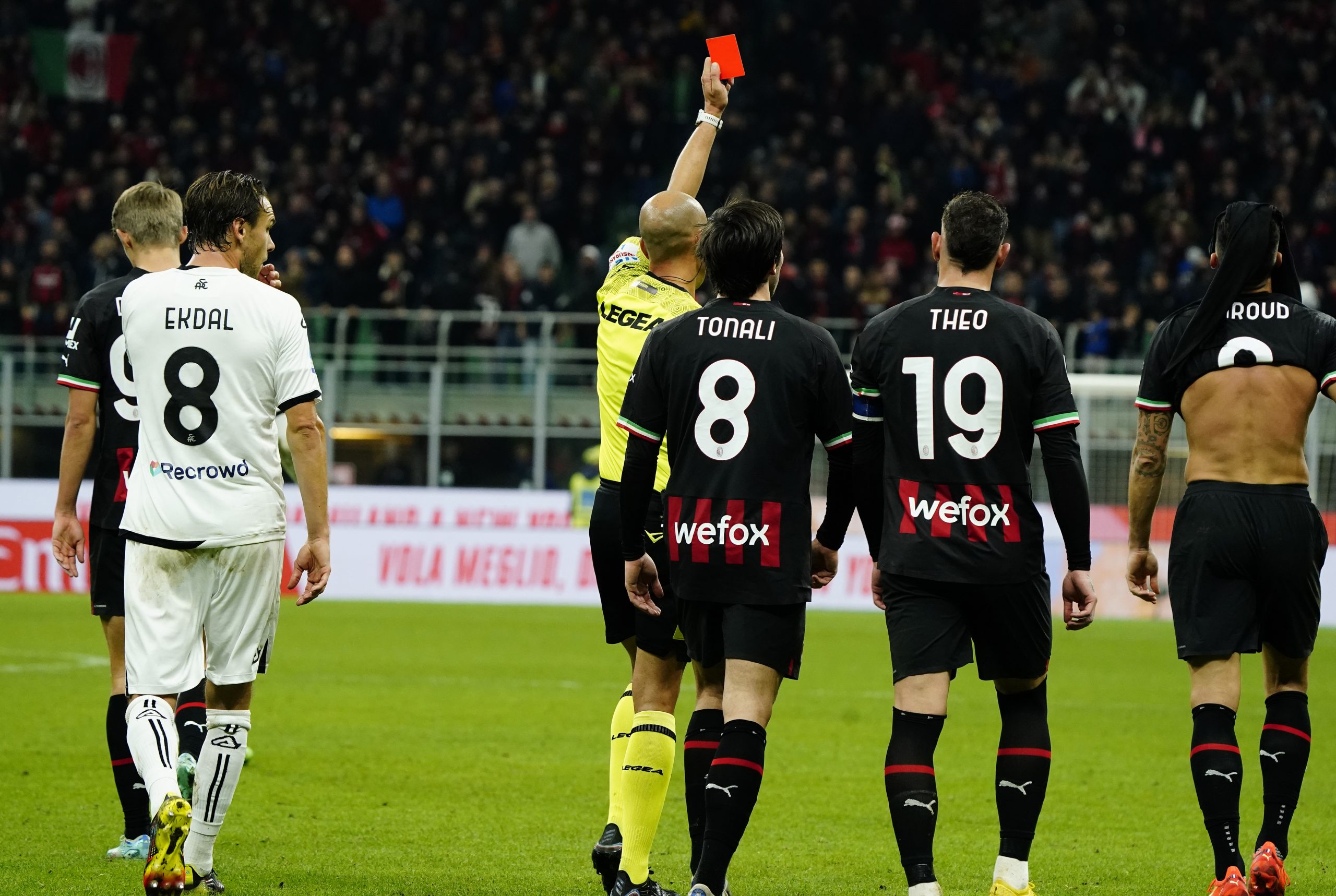 MILAN, ITALY - NOVEMBER 05: Olivier Giroud of AC Milan is expelled by referee during the Serie A match between AC MIlan and Spezia Calcio at Stadio Giuseppe Meazza on November 05, 2022 in Milan, Italy. (Photo by Pier Marco Tacca/AC Milan via Getty Images)