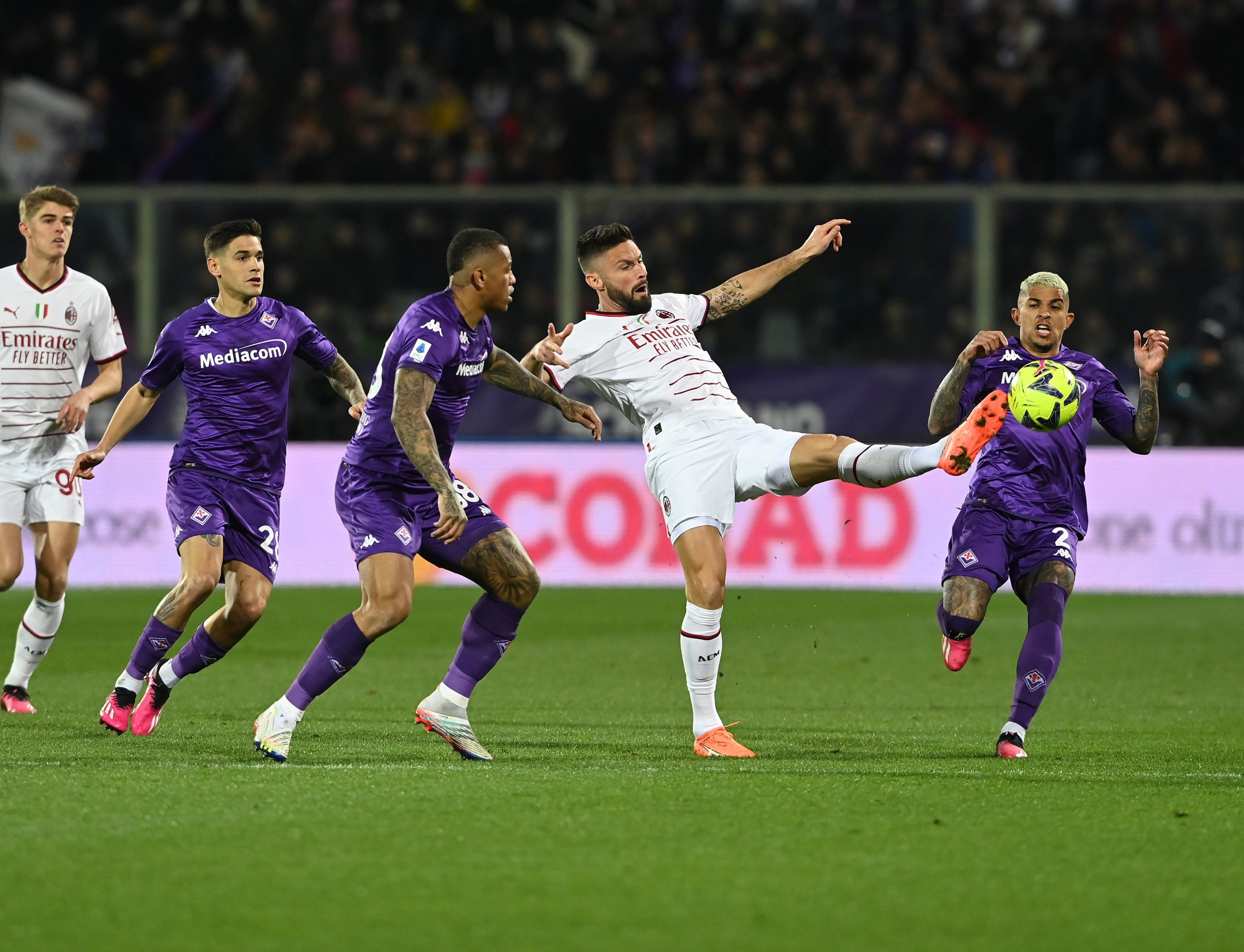 Nella prima frazione di gioco i rossoneri soffrono il pressing della squadra padrone di casa, la quale al 26′ vede negarsi sulla linea di porta da Tomori l’ipotetico gol del vantaggio. Sei minuti dopo il Milan sfiora il vantaggio su una conclusione al volo del solito Olivier Giroud, che viene però neutralizzata da Terracciano. Il primo tempo al Franchi si conclude con più del 60% del possesso palla a favore della formazione viola.
