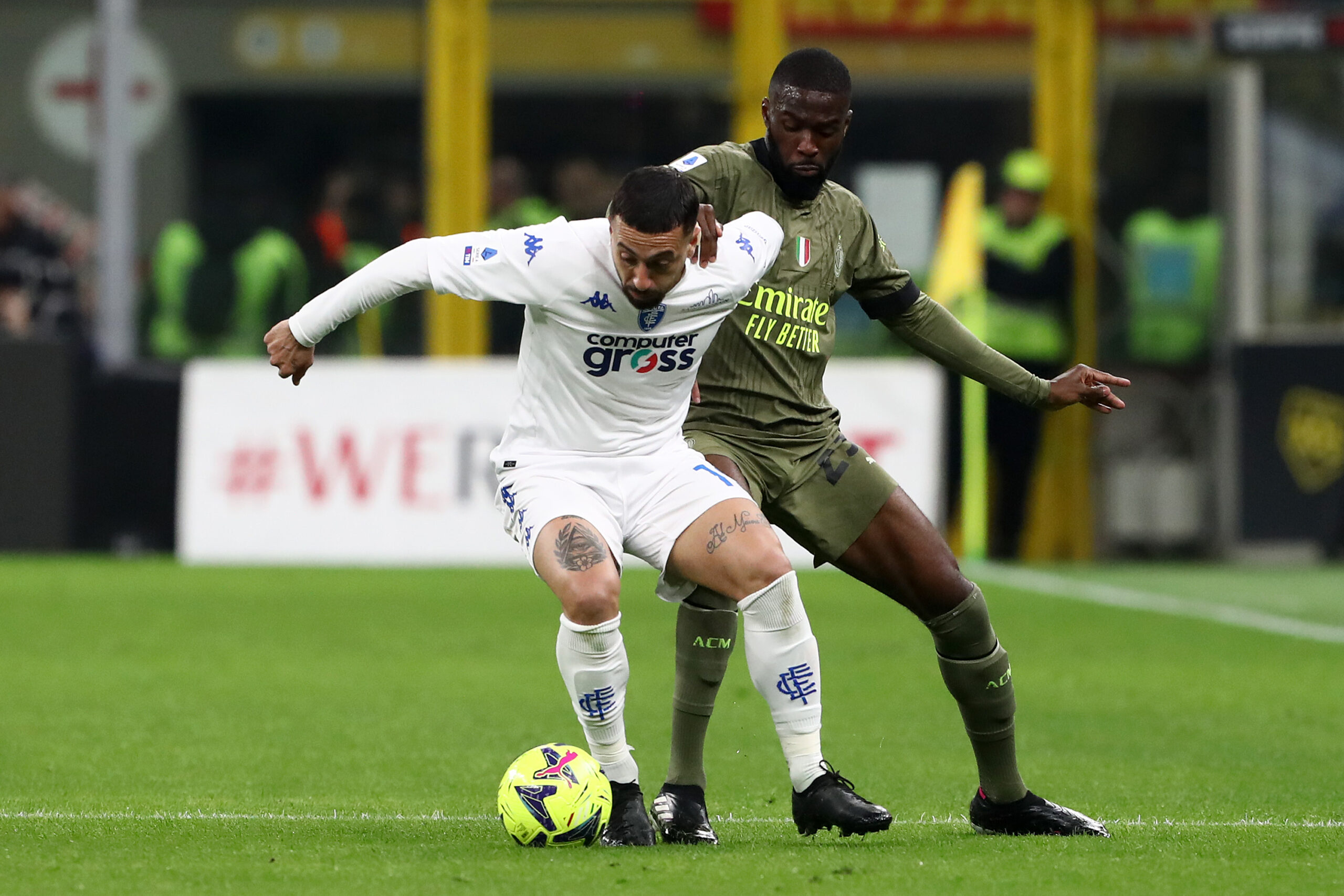 MILAN, ITALY - APRIL 07: Francesco Caputo of Empoli FC is put under pressure by Fikayo Tomori of AC Milan during the Serie A match between AC Milan and Empoli FC at Stadio Giuseppe Meazza on April 07, 2023 in Milan, Italy. (Photo by Marco Luzzani/Getty Images)