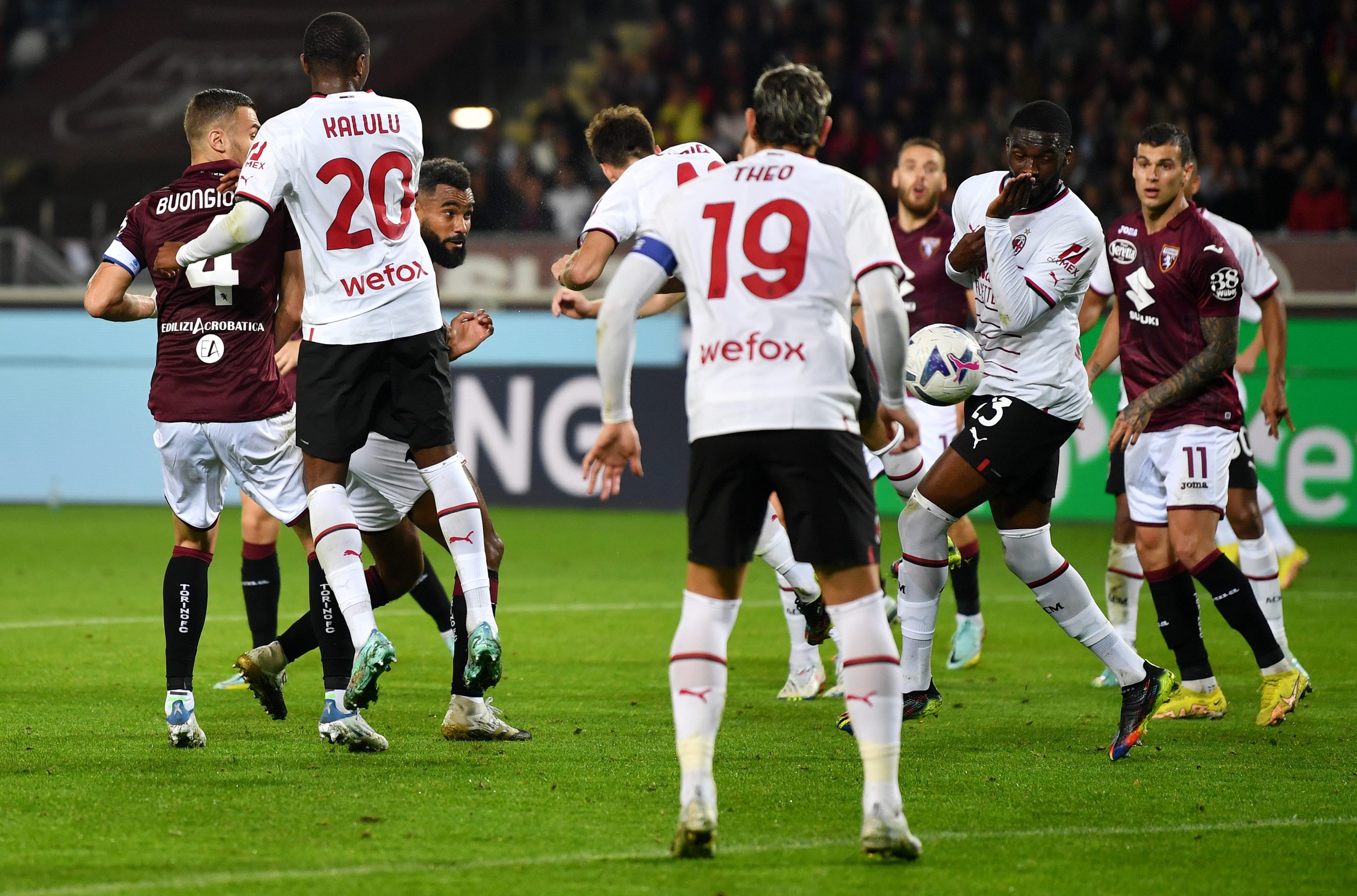 TURIN, ITALY - OCTOBER 30: Koffi Djidji of Torino FC scores their side's first goal during the Serie A match between Torino FC and AC MIlan at Stadio Olimpico di Torino on October 30, 2022 in Turin, Italy. (Photo by Valerio Pennicino/Getty Images)