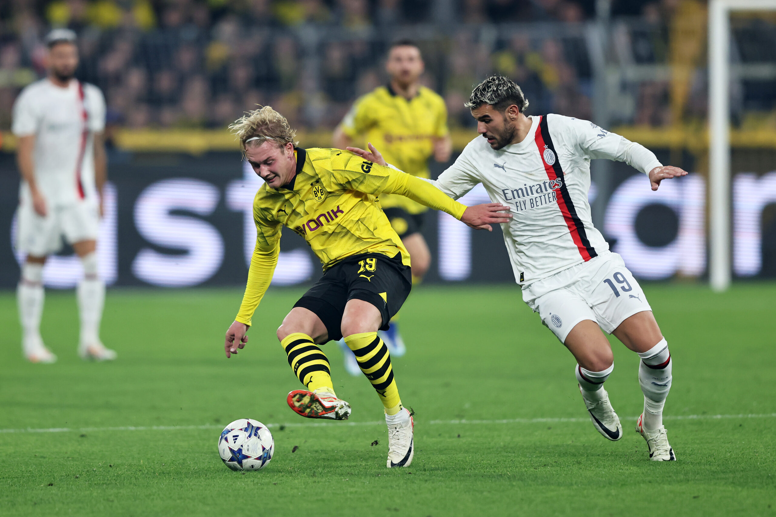 DORTMUND, GERMANY - OCTOBER 04: Julian Brandt of Borussia Dortmund runs with the ball whilst under pressure from Theo Hernandez of AC Milan during the UEFA Champions League match between Borussia Dortmund and AC Milan at Signal Iduna Park on October 04, 2023 in Dortmund, Germany. (Photo by Christof Koepsel/Getty Images)