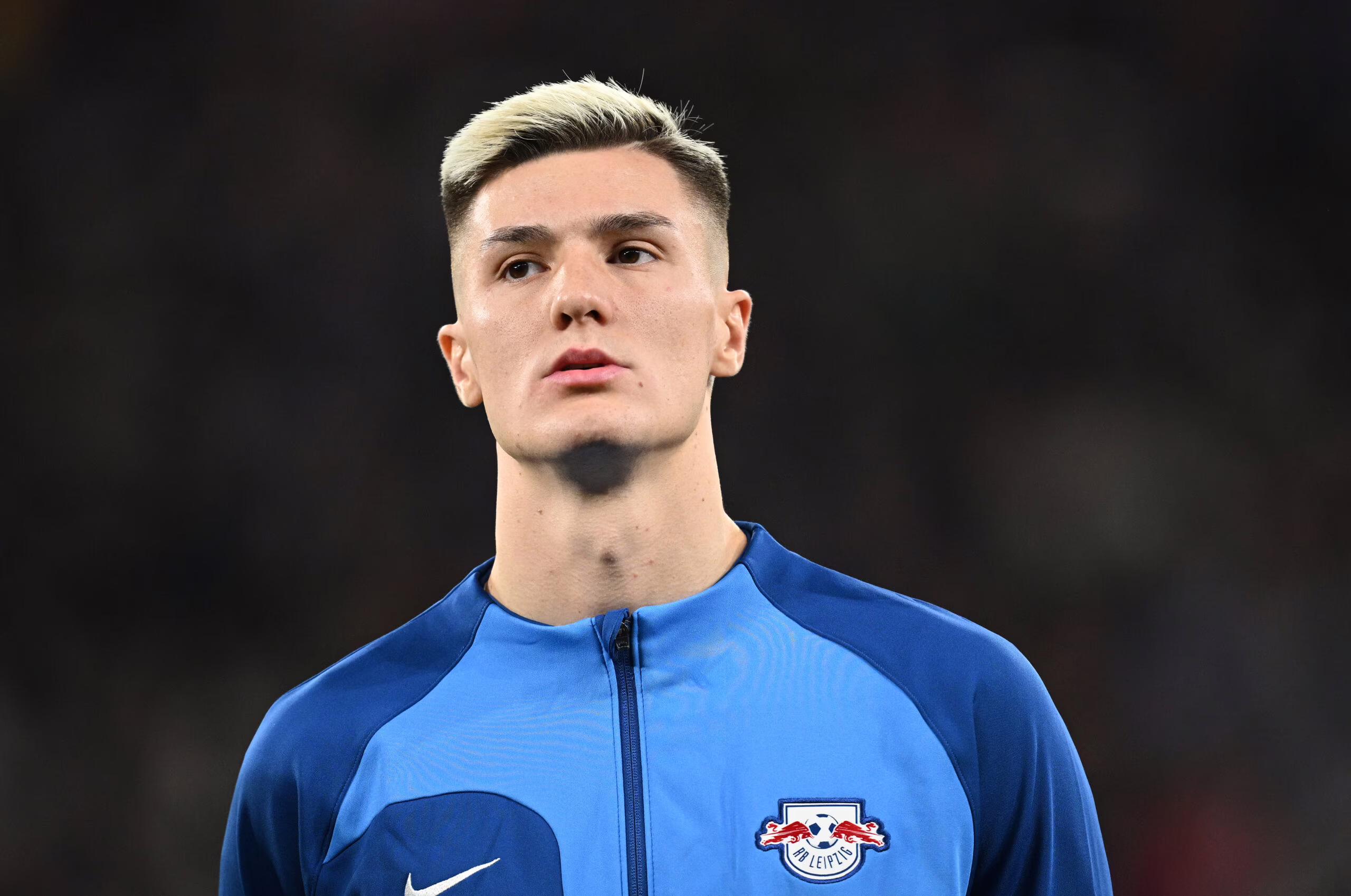 LEIPZIG, GERMANY - FEBRUARY 13: Benjamin Sesko of Leipzig lines up prior to the UEFA Champions League 2023/24 round of 16 first leg match between RB Leipzig and Real Madrid CF at Red Bull Arena on February 13, 2024 in Leipzig, Germany. (Photo by Stuart Franklin/Getty Images)