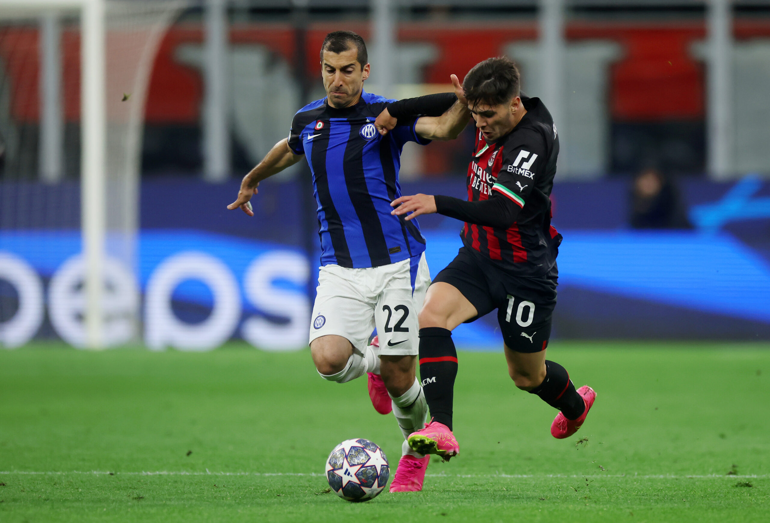 MILAN, ITALY - MAY 10: Henrikh Mkhitaryan of FC Internazionale challenges Brahim Diaz of AC Milan during the UEFA Champions League semi-final first leg match between AC Milan and FC Internazionale at San Siro on May 10, 2023 in Milan, Italy. (Photo by Alex Grimm/Getty Images)