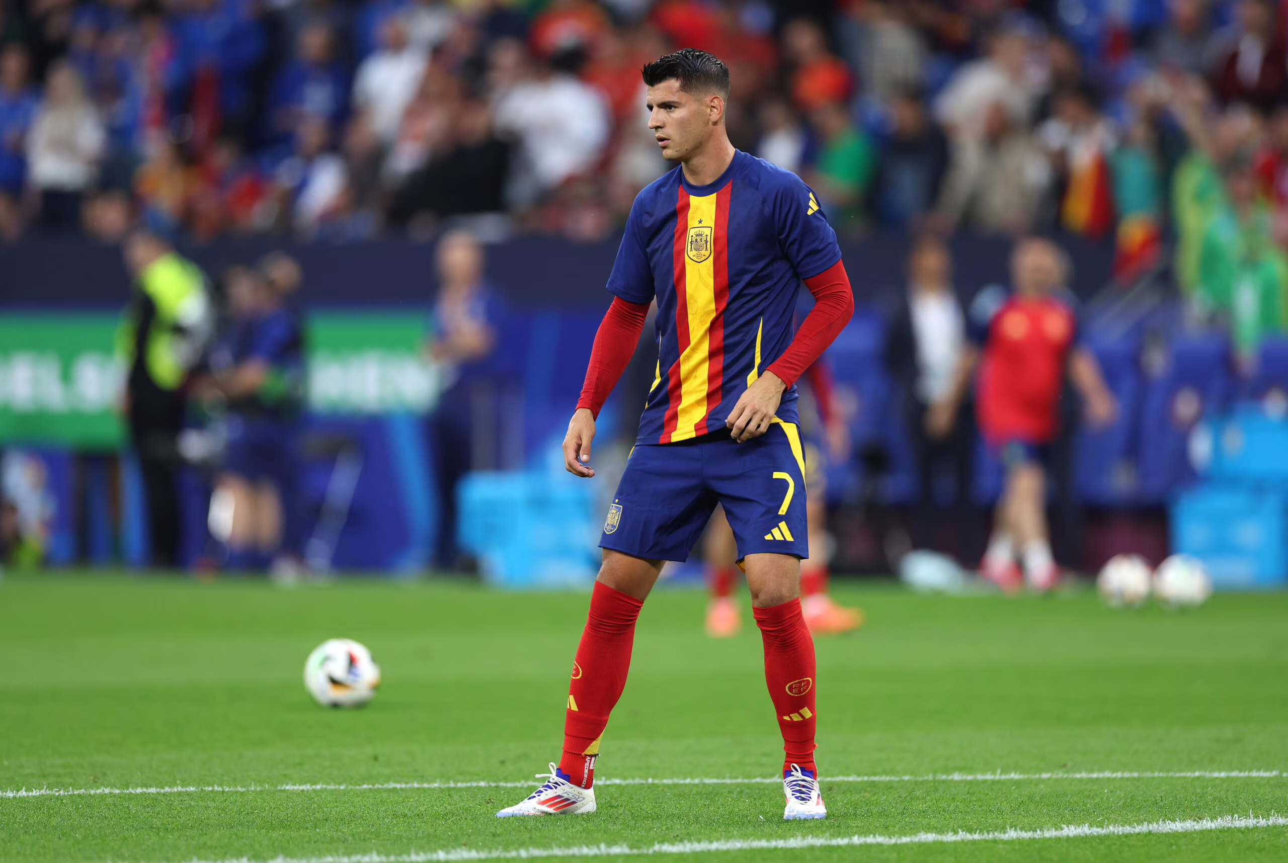 GELSENKIRCHEN, GERMANY - JUNE 20: Alvaro Morata of Spain looks on as he warms up prior to the UEFA EURO 2024 group stage match between Spain and Italy at Arena AufSchalke on June 20, 2024 in Gelsenkirchen, Germany. (Photo by Kevin C. Cox/Getty Images)