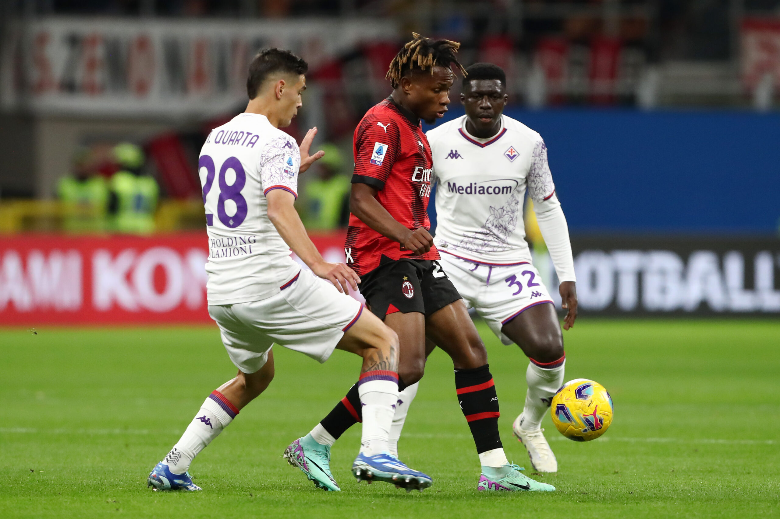 MILAN, ITALY - NOVEMBER 25: Samuel Chukwueze of AC Milan is challenged by Lucas Martinez Quarta and Alfred Duncan of ACF Fiorentina during the Serie A TIM match between AC Milan and ACF Fiorentina at Stadio Giuseppe Meazza on November 25, 2023 in Milan, Italy. (Photo by Marco Luzzani/Getty Images)