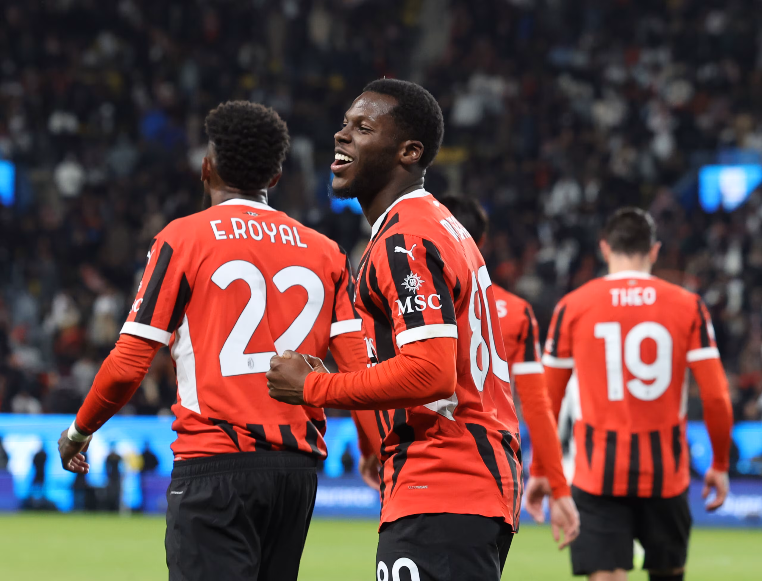 RIYADH, SAUDI ARABIA - JANUARY 03: Yunus Musah of AC Milan celebrates (C) after scoring the goal during the Italian Super Cup Semi-Final match between AC Milan and Juventus at Al Awwal Park on January 03, 2025 in Riyadh, Saudi Arabia. (Photo by Claudio Villa/AC Milan via Getty Images)