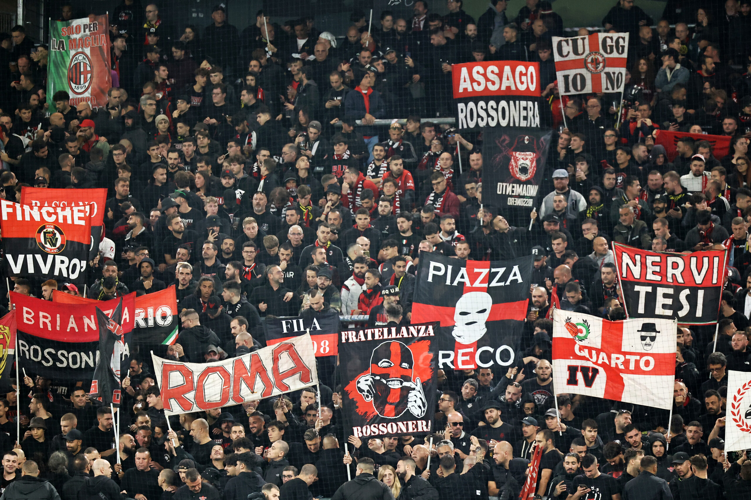 DORTMUND, GERMANY - OCTOBER 04: Fans of AC Milan show their support prior to the UEFA Champions League match between Borussia Dortmund and AC Milan at Signal Iduna Park on October 04, 2023 in Dortmund, Germany. (Photo by Christof Koepsel/Getty Images)