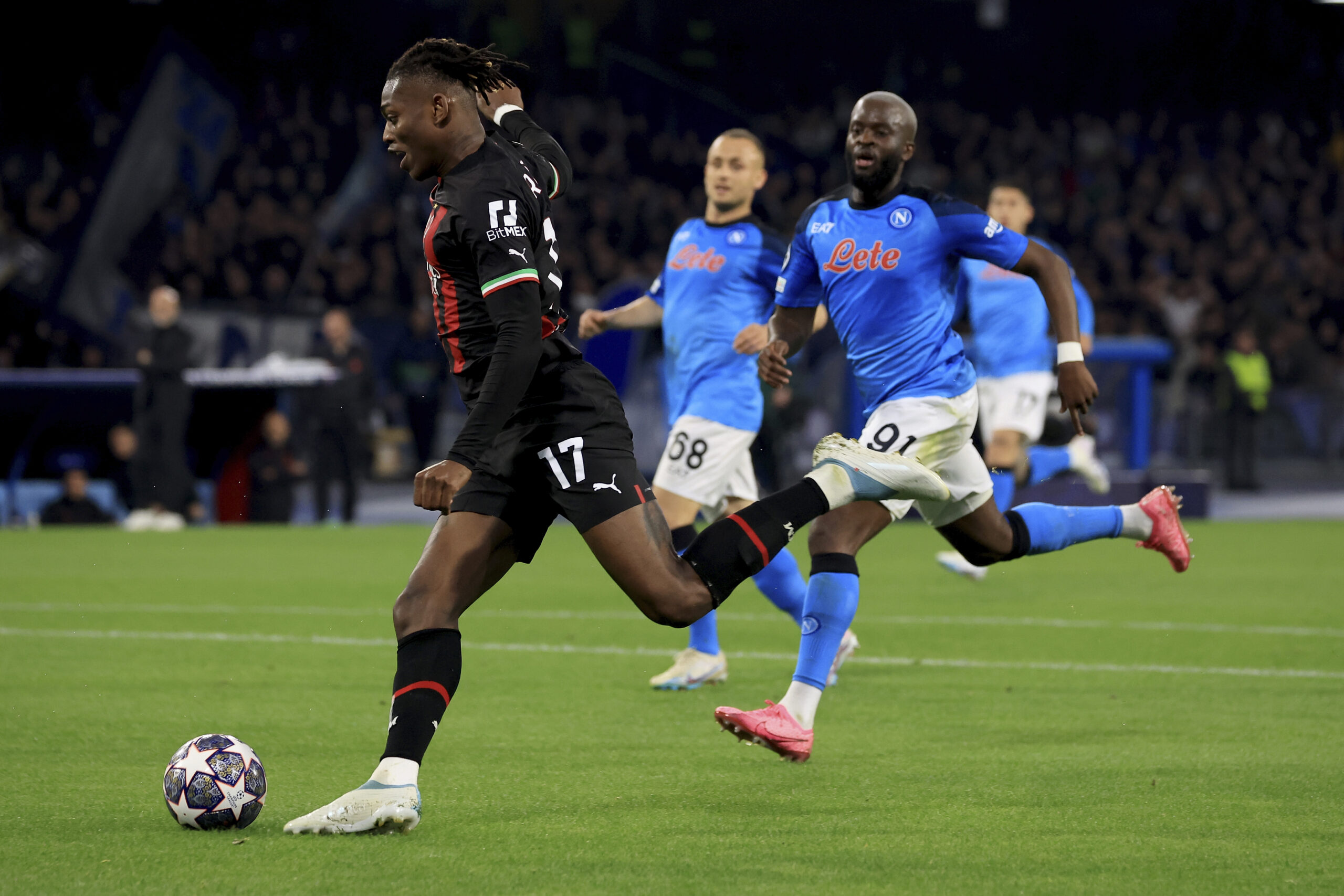 NAPLES, ITALY - APRIL 18: Rafael Leao of AC Milan in action during the UEFA Champions League quarterfinal second leg match between SSC Napoli and AC Milan at Stadio Diego Armando Maradona on April 18, 2023 in Naples, Italy. (Photo by Giuseppe Cottini/AC Milan via Getty Images)