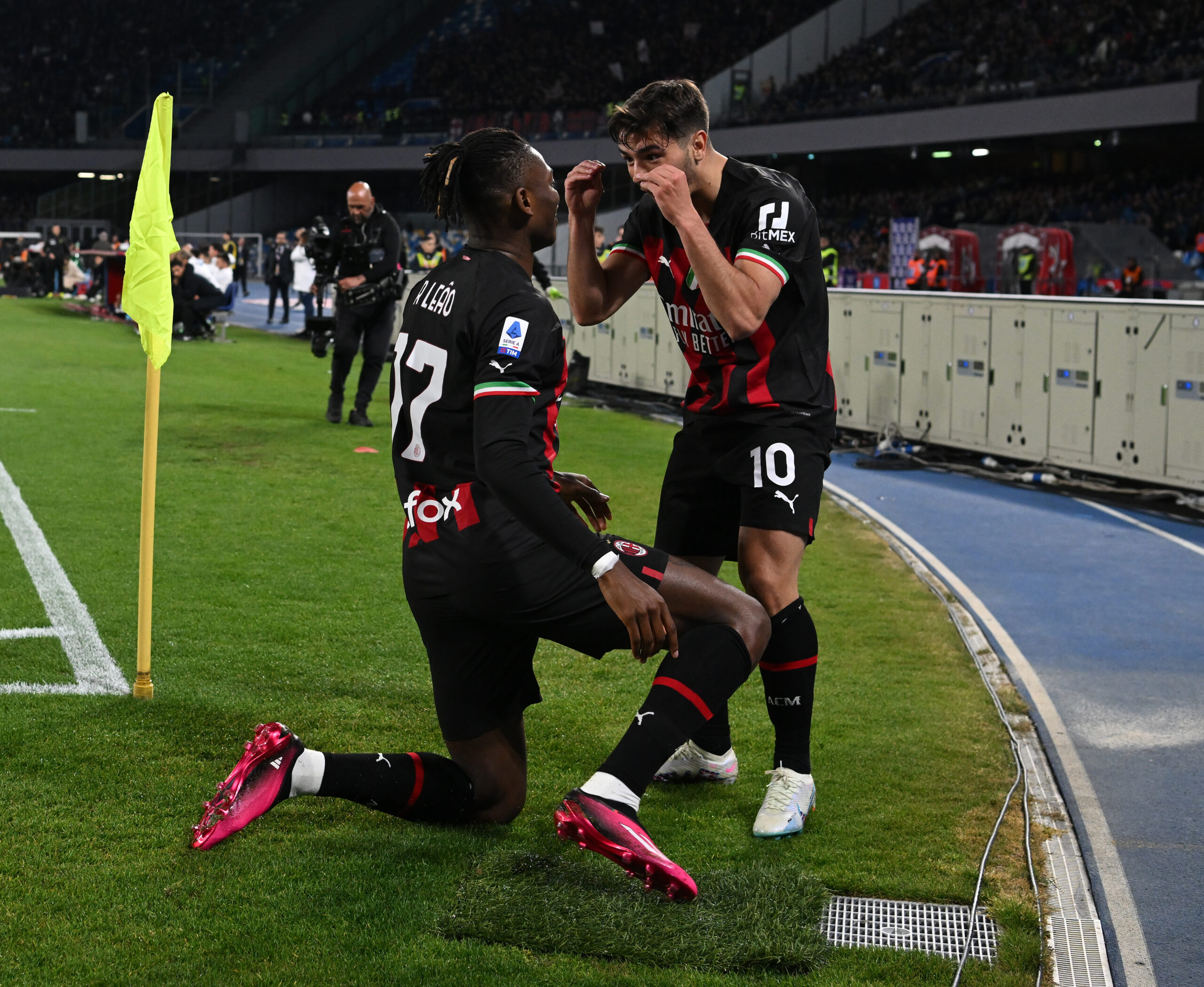 NAPLES, ITALY - APRIL 02: Brahim Diaz of AC Milan celebrates with team-mates after scoring the second goal during the Serie A match between SSC Napoli and AC Milan at Stadio Diego Armando Maradona on April 02, 2023 in Naples, Italy. (Photo by Claudio Villa/AC Milan via Getty Images)