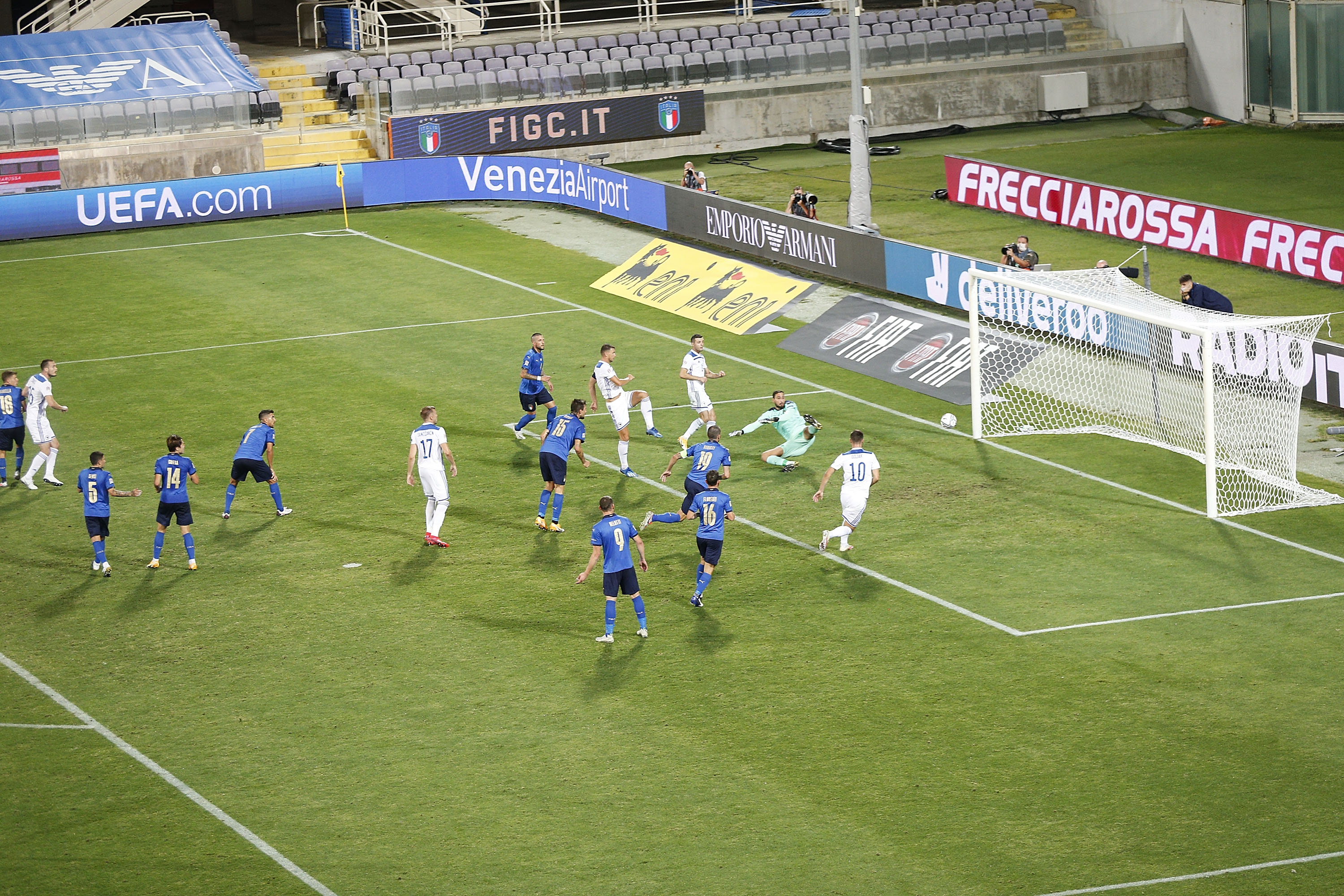 FLORENCE, ITALY - SEPTEMBER 04: Edin Dzeko of Bosnia-Herzegovina scores the opening goal during the UEFA Nations League group stage match between Italy and Bosnia and Herzegovina at Artemio Franchi on September 4, 2020 in Florence, Italy. (Photo by Gabriele Maltinti/Getty Images)