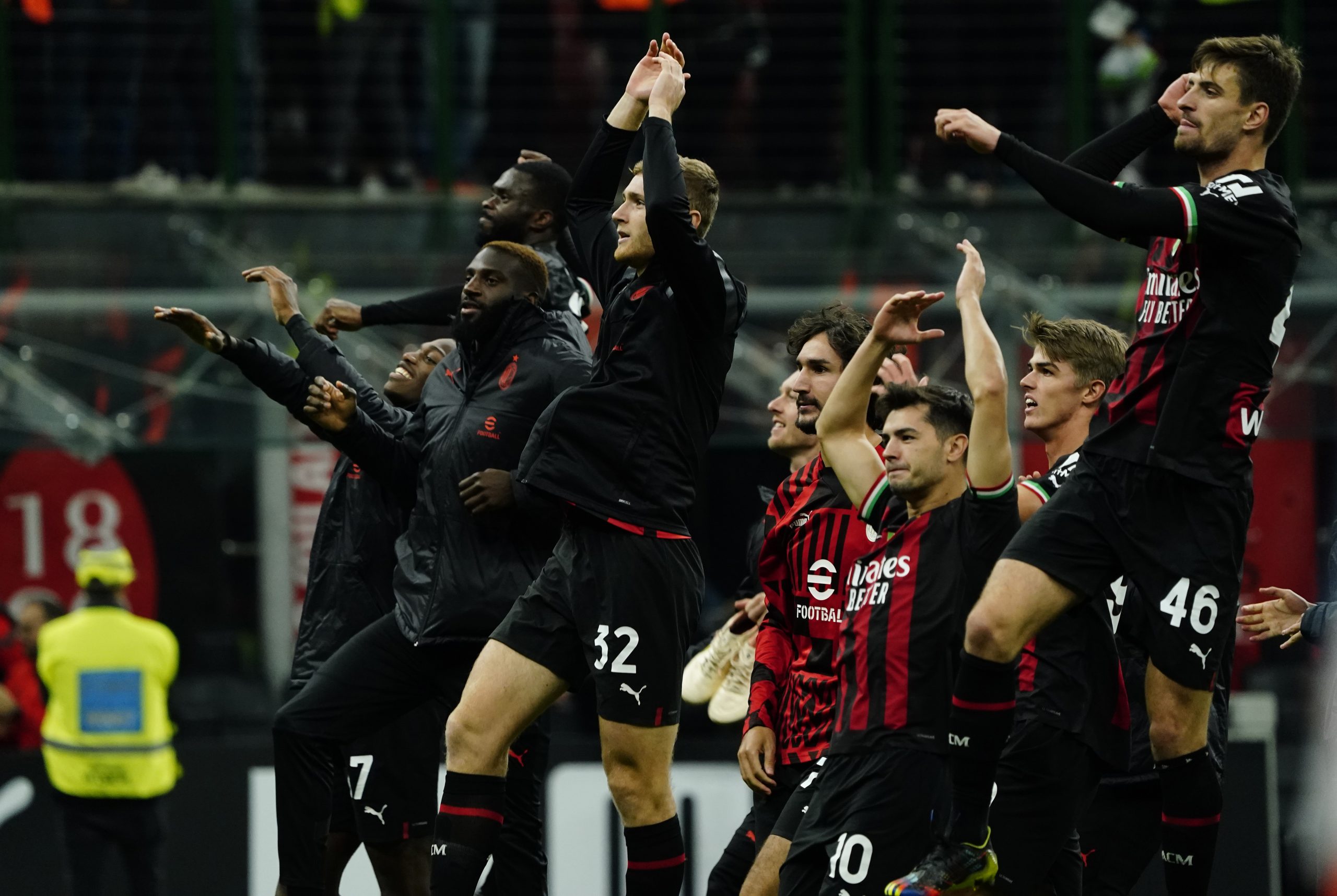 MILAN, ITALY - NOVEMBER 05: AC Milan players celebrate the victory at the end of the Serie A match between AC MIlan and Spezia Calcio at Stadio Giuseppe Meazza on November 05, 2022 in Milan, Italy. (Photo by Pier Marco Tacca/AC Milan via Getty Images)