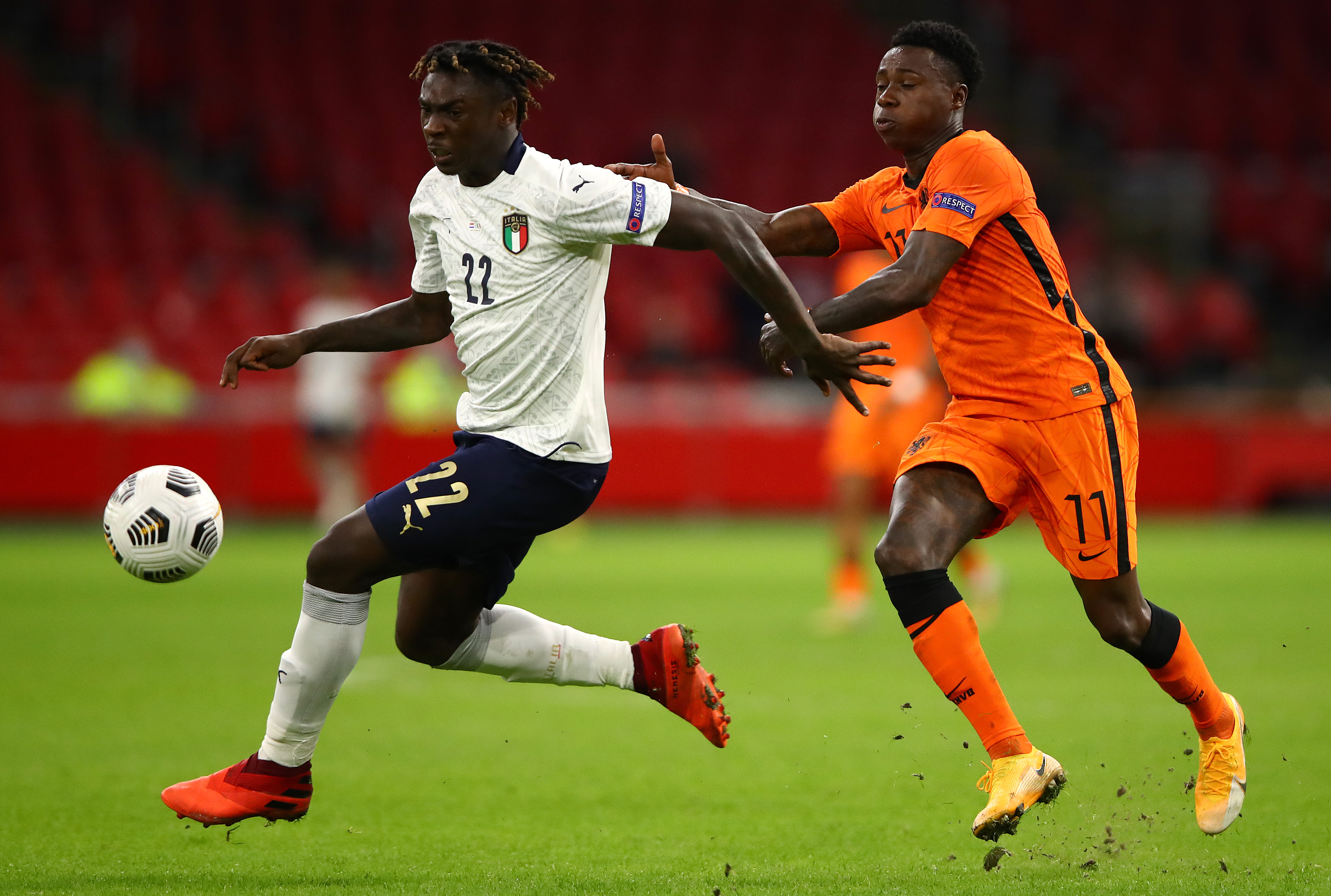 AMSTERDAM, NETHERLANDS - SEPTEMBER 07: Moise Kean of Italy evades Quincy Promes of the Netherlands during the UEFA Nations League group stage match between Netherlands and Italy at Johan Cruijff Arena on September 07, 2020 in Amsterdam, Netherlands. (Photo by Dean Mouhtaropoulos/Getty Images)