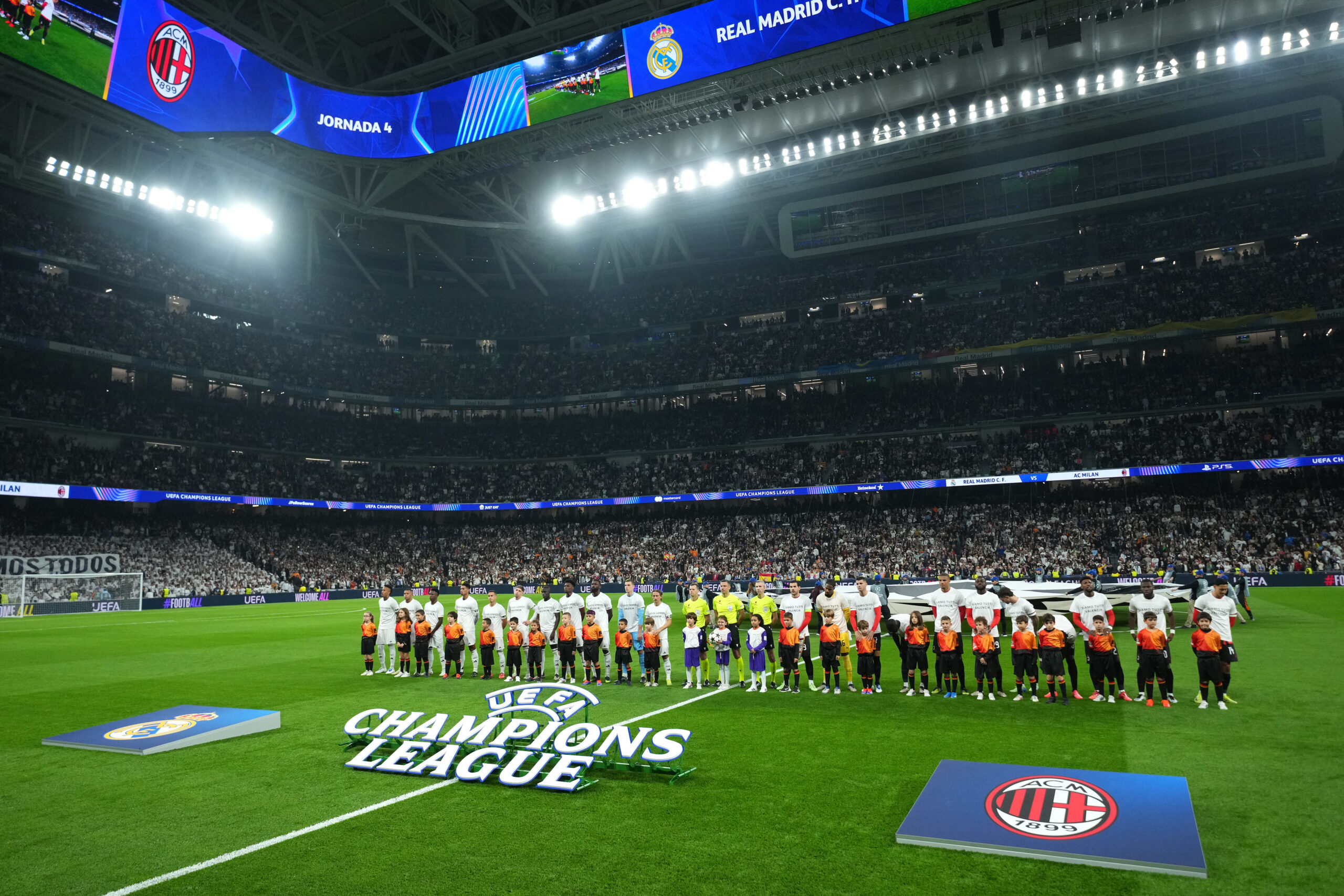 MADRID, SPAIN - NOVEMBER 05: The players of Real Madrid and AC Milan line up prior to kick-off ahead of the UEFA Champions League 2024/25 League Phase MD4 match between Real Madrid C.F. and AC Milan at Estadio Santiago Bernabeu on November 05, 2024 in Madrid, Spain. (Photo by Angel Martinez/Getty Images)