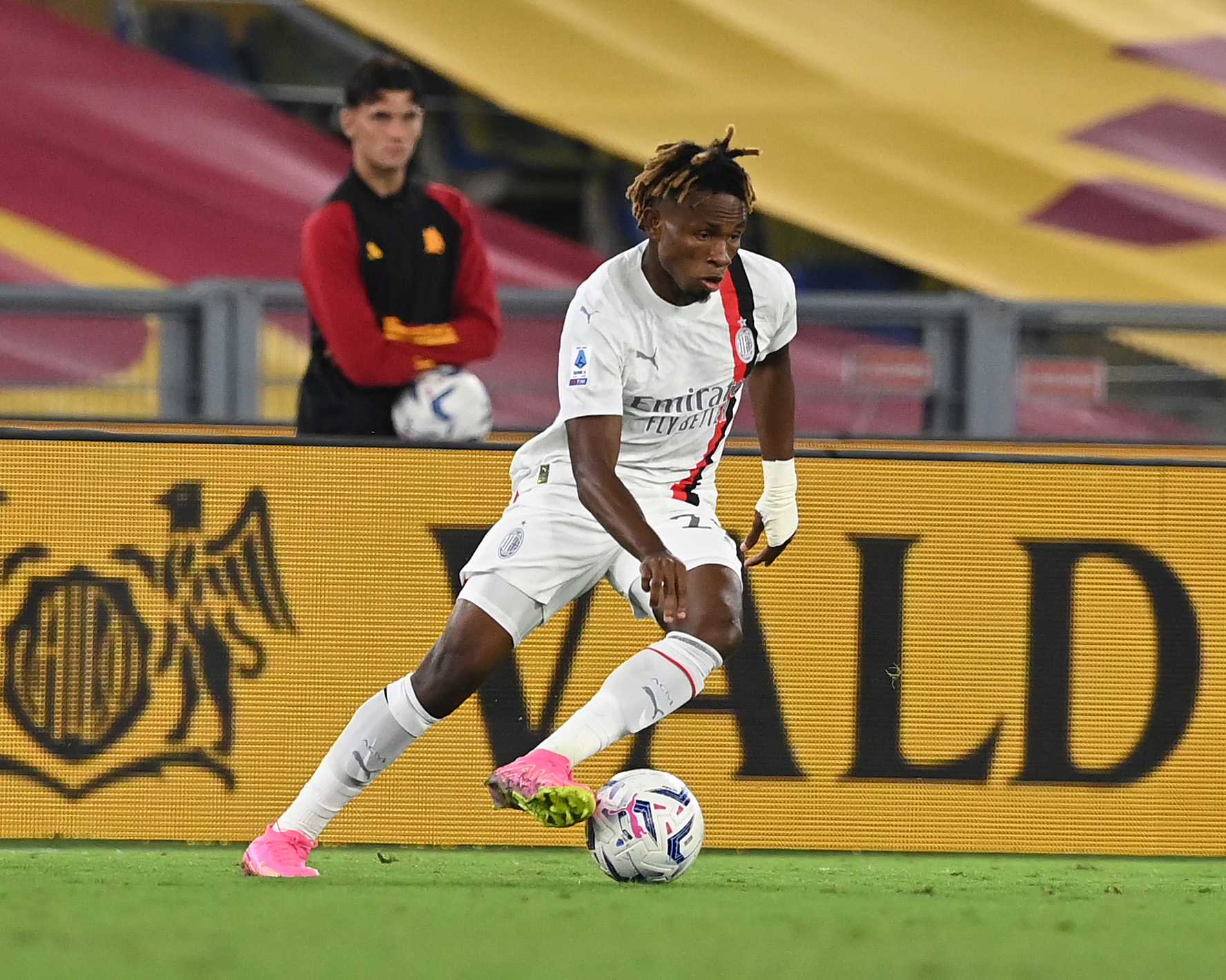 ROME, ITALY - SEPTEMBER 01: Okafor Noah of AC Milan in action during the Serie A TIM match between AS Roma and AC Milan at Stadio Olimpico on September 01, 2023 in Rome, Italy. (Photo by Claudio Villa/AC Milan via Getty Images)