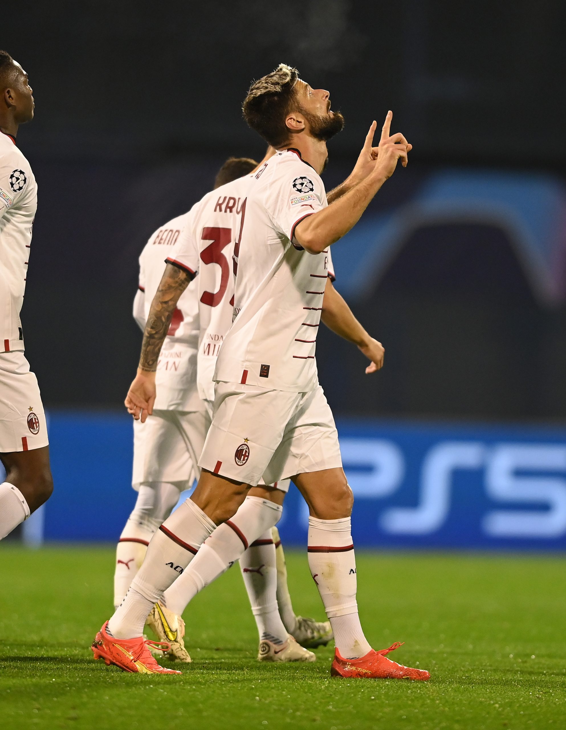 ZAGREB, CROATIA - OCTOBER 25: Olivier Giroud of AC Milan celebrates after scoring the goal during the UEFA Champions League group E match between Dinamo Zagreb and AC Milan at Stadion Maksimir on October 25, 2022 in Zagreb, Croatia. (Photo by Claudio Villa/AC Milan via Getty Images)