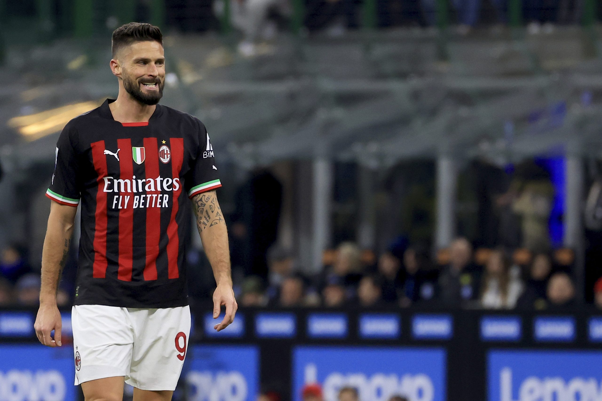 MILAN, ITALY - FEBRUARY 05: Olivier Giroud of AC Milan shows his dejection during the Serie A match between FC Internazionale and AC MIlan at Stadio Giuseppe Meazza on February 05, 2023 in Milan, Italy. (Photo by Giuseppe Cottini/AC Milan via Getty Images)