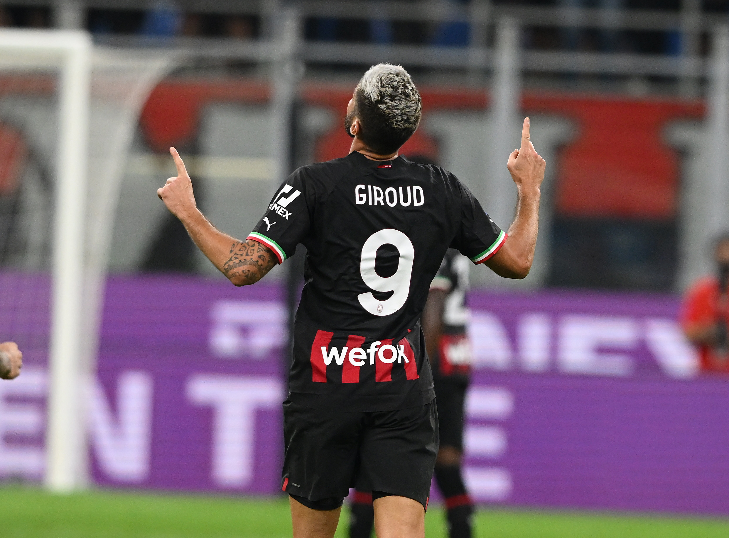 MILAN, ITALY - SEPTEMBER 18: Olivier Giroud of AC Milan celebrates after scores the goal during the Serie A match between AC Milan and SSC Napoli at Stadio Giuseppe Meazza on September 18, 2022 in Milan, Italy. (Photo by Claudio Villa/AC Milan via Getty Images)
