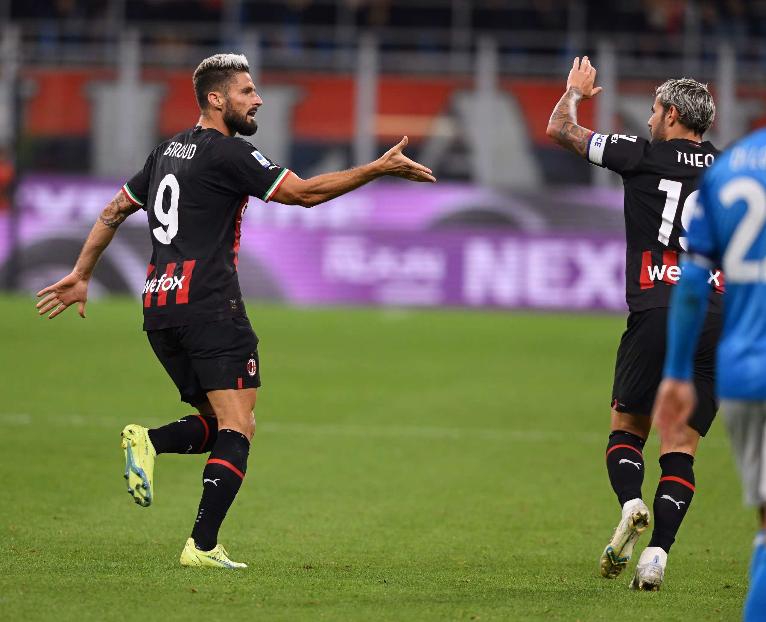 MILAN, ITALY - SEPTEMBER 18: Olivier Giroud of AC Milan celebrates after scores the goal during the Serie A match between AC Milan and SSC Napoli at Stadio Giuseppe Meazza on September 18, 2022 in Milan, Italy. (Photo by Claudio Villa/AC Milan via Getty Images)