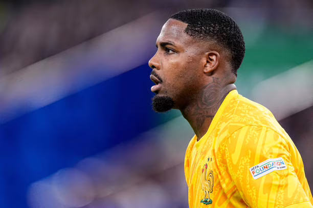 HAMBURG, GERMANY - JULY 5: Mike Maignan of France looks up during the Quarter-Final - UEFA EURO 2024 match between Portugal and France at Volksparkstadion on July 5, 2024 in Hamburg, Germany. (Photo by Joris Verwijst/BSR Agency/Getty Images)