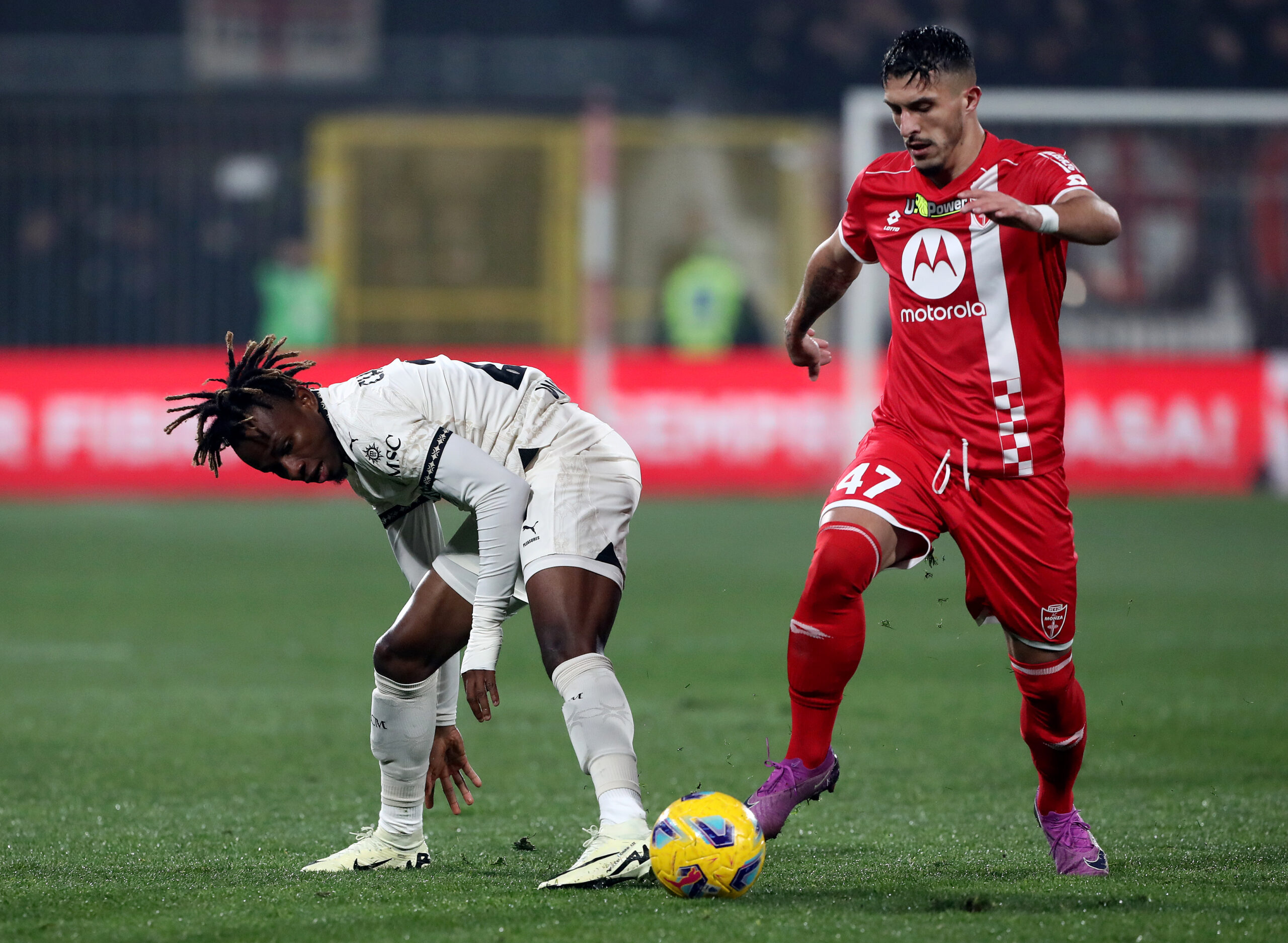MONZA, ITALY - FEBRUARY 18: Dany Mota of AC Monza is challenged by Samuel Chukwueze of AC Milan during the Serie A TIM match between AC Monza and AC Milan at U-Power Stadium on February 18, 2024 in Monza, Italy. (Photo by Marco Luzzani/Getty Images)