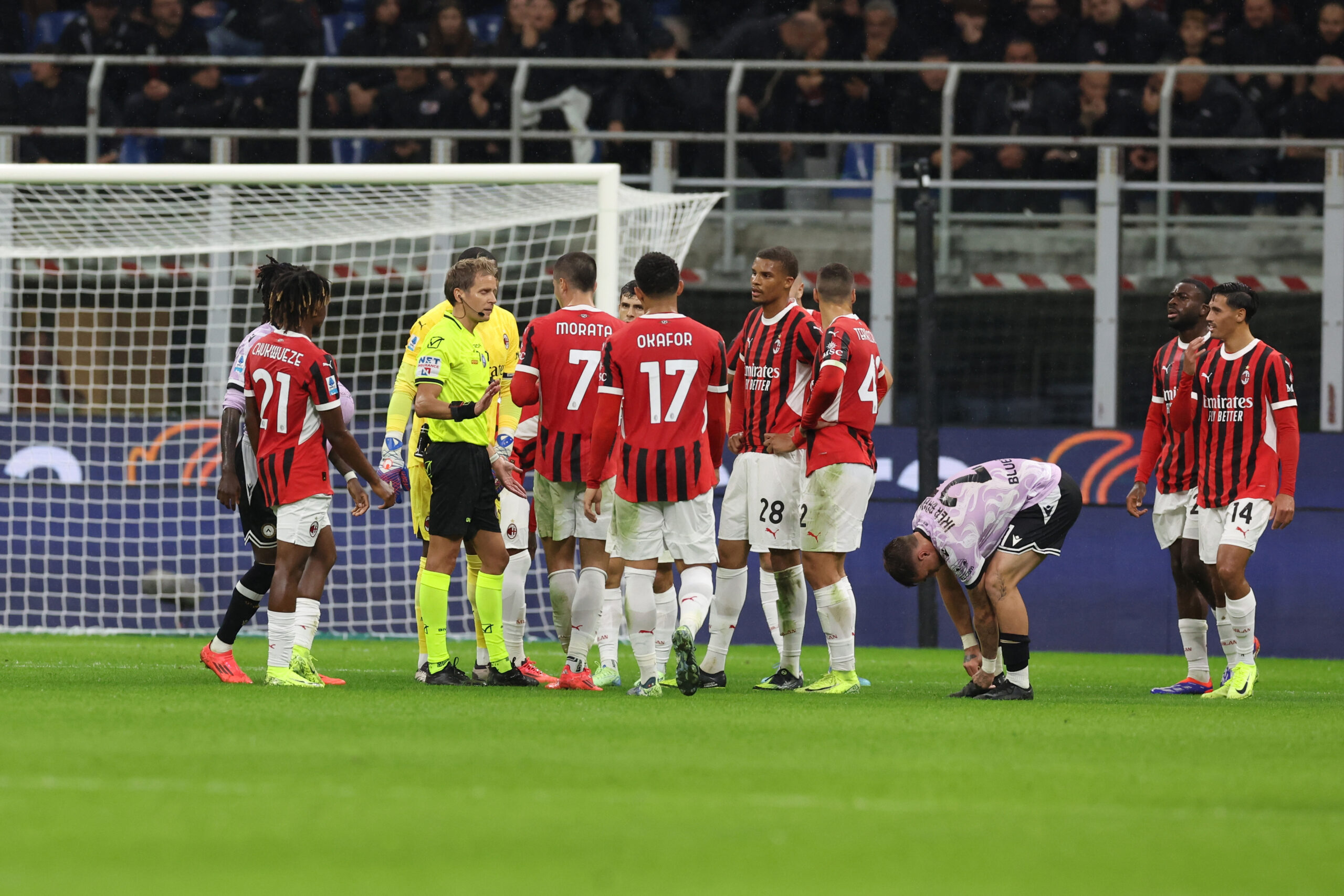 MILAN, ITALY - OCTOBER 19: Players of AC Milan reacts during the Serie A match between Milan and Udinese at Stadio Giuseppe Meazza on October 19, 2024 in Milan, Italy. (Photo by Claudio Villa/AC Milan via Getty Images)