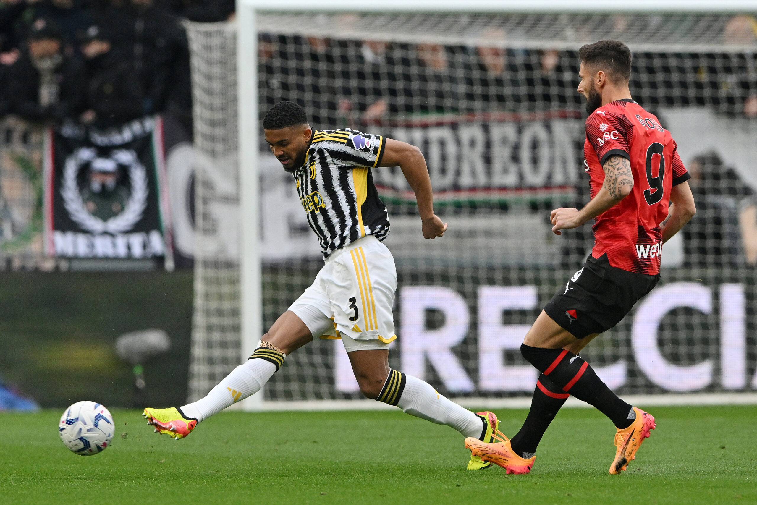 TURIN, ITALY - APRIL 27: Gleison Bremer of Juventus competes for the ball with Olivier Giroud of AC Milan during the Serie A TIM match between Juventus and AC Milan at Allianz Stadium on April 27, 2024 in Turin, Italy. (Photo by Chris Ricco - Juventus FC/Juventus FC via Getty Images)