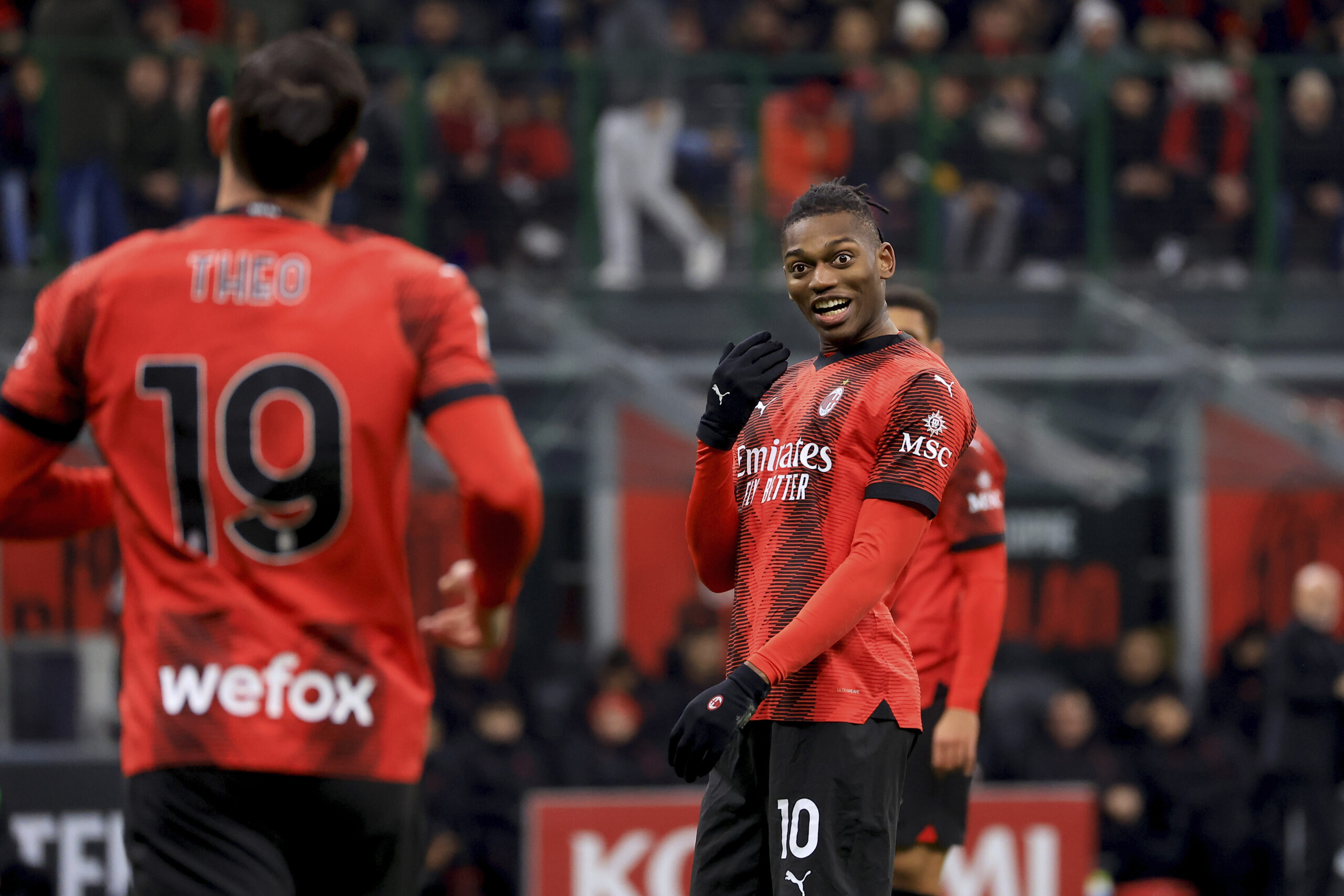 MILAN, ITALY - JANUARY 10: Rafael Leao (R) of AC Milan speaks with Theo Hernandez (L) during the Coppa Italia match between AC Milan and Atalanta BC on January 10, 2024 in Milan, Italy. (Photo by Giuseppe Cottini/AC Milan via Getty Images)