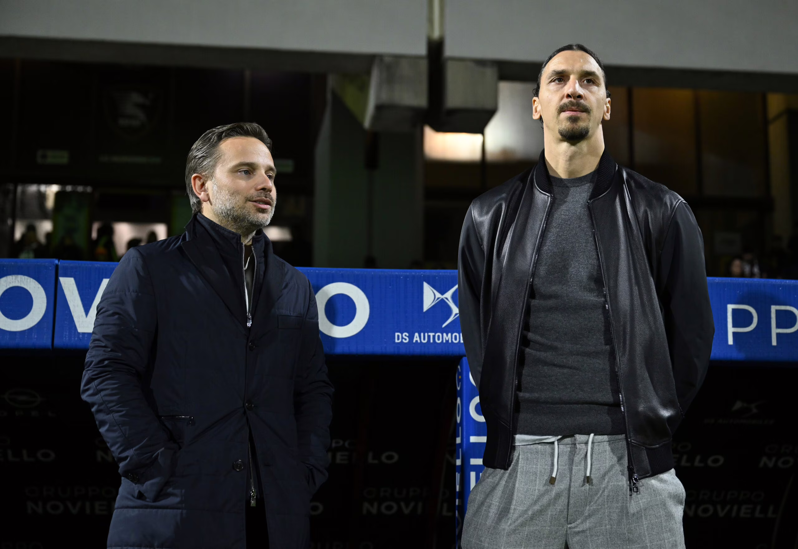 SALERNO, ITALY - DECEMBER 22: Senior Advisor to Ownership, Zlatan Ibrahimovic and CEO of AC Milan Giorgio Furlani attend before the Serie A TIM match between US Salernitana and AC Milan at Stadio Arechi on December 22, 2023 in Salerno, Italy. (Photo by Claudio Villa/AC Milan via Getty Images)