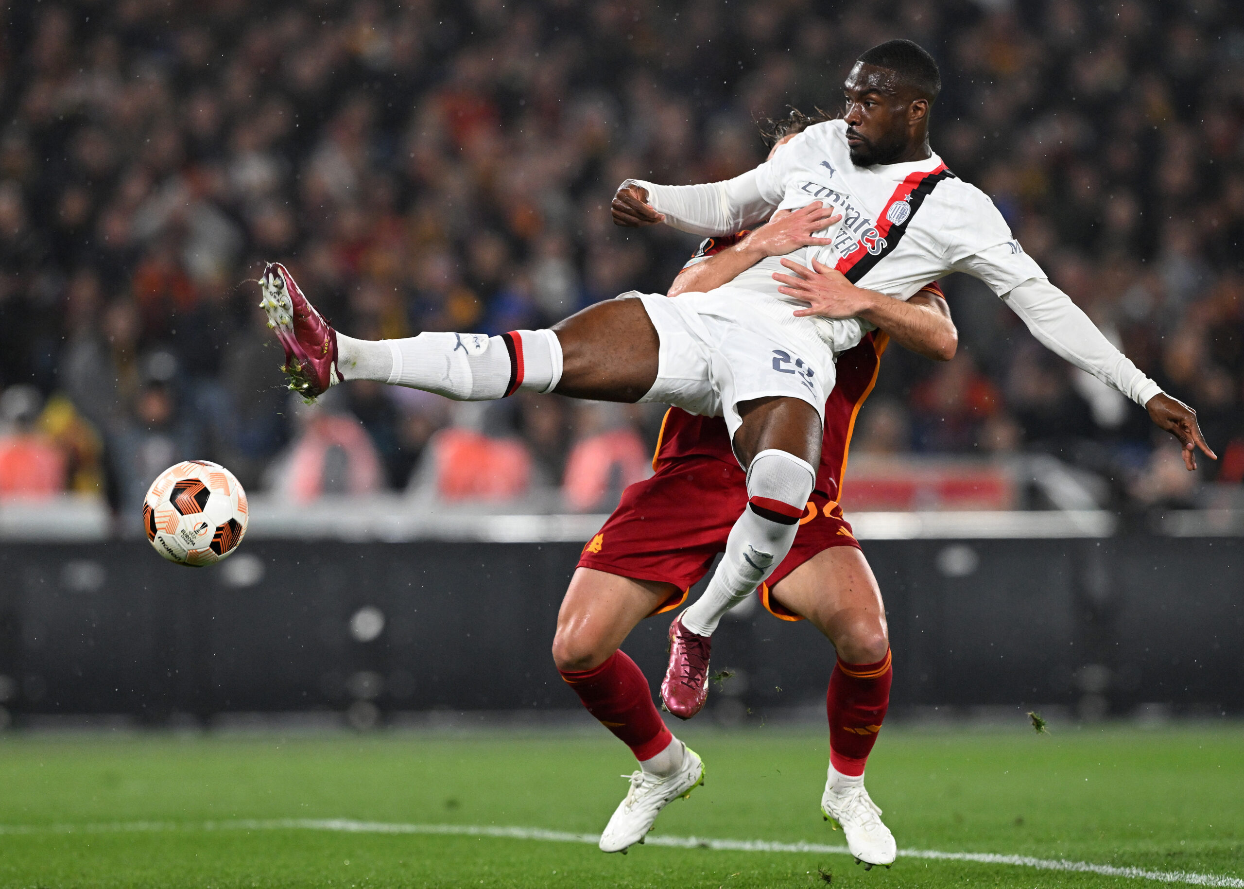 ROME, ITALY - APRIL 18: Fikayo Tomori of AC Milan battles for possession with Edoardo Bove of AS Roma during the UEFA Europa League 2023/24 Quarter-Final second leg match between AS Roma and AC Milan at Stadio Olimpico on April 18, 2024 in Rome, Italy. (Photo by Francesco Pecoraro - AC Milan/AC Milan via Getty Images)