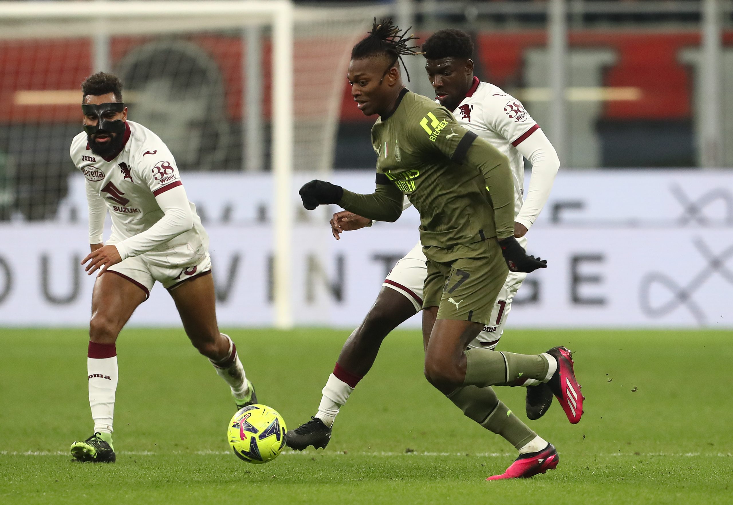 MILAN, ITALY - FEBRUARY 10: Rafael Leãoof AC Milan is challenged by Ndary Adopo of Torino during the Serie A match between AC MIlan and Torino FC at Stadio Giuseppe Meazza on February 10, 2023 in Milan, . (Photo by Marco Luzzani/Getty Images)