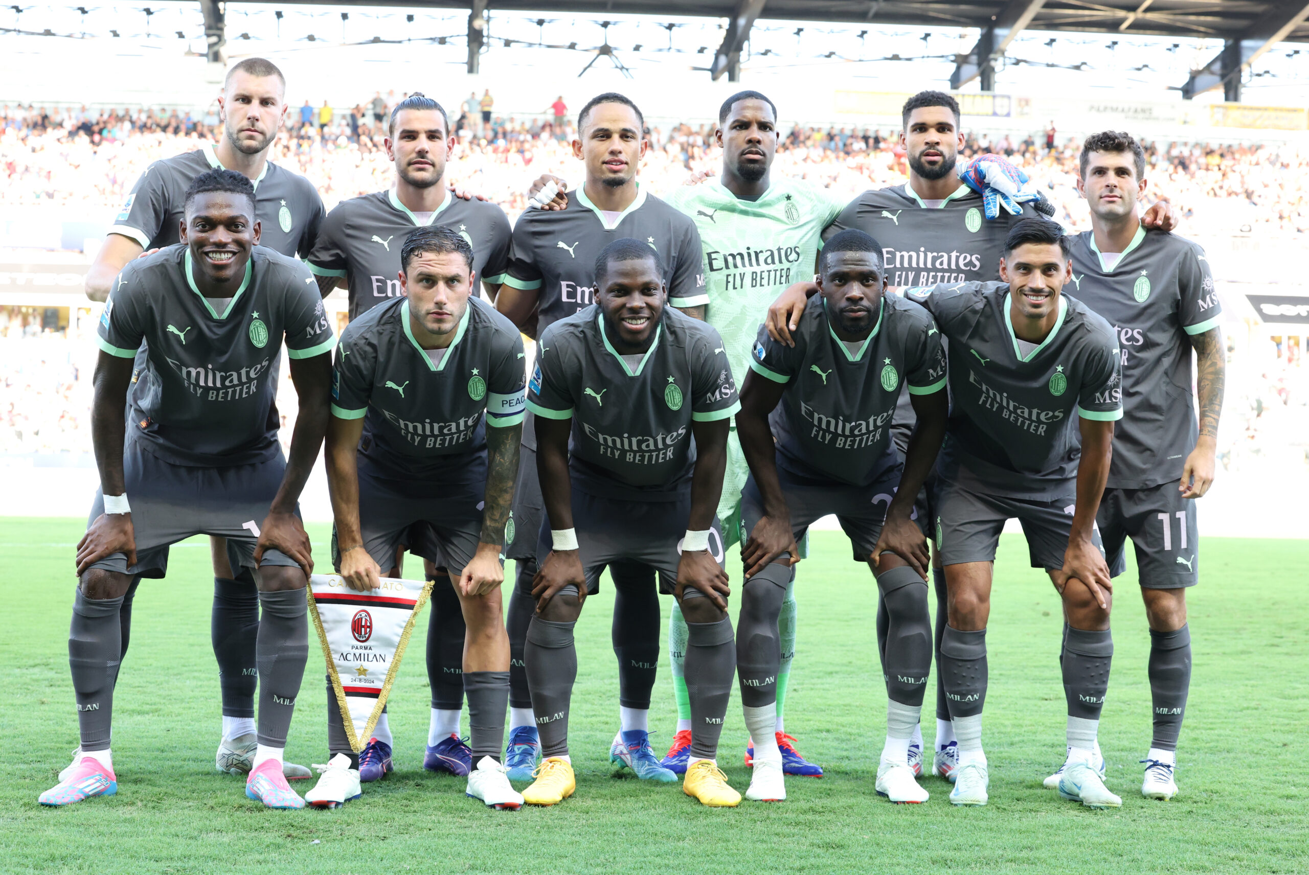 PARMA, ITALY - AUGUST 24: Players of AC Milan line up prior to the Serie match between Parma and Milan at Stadio Ennio Tardini on August 24, 2024 in Parma, Italy. (Photo by Claudio Villa/AC Milan via Getty Images)