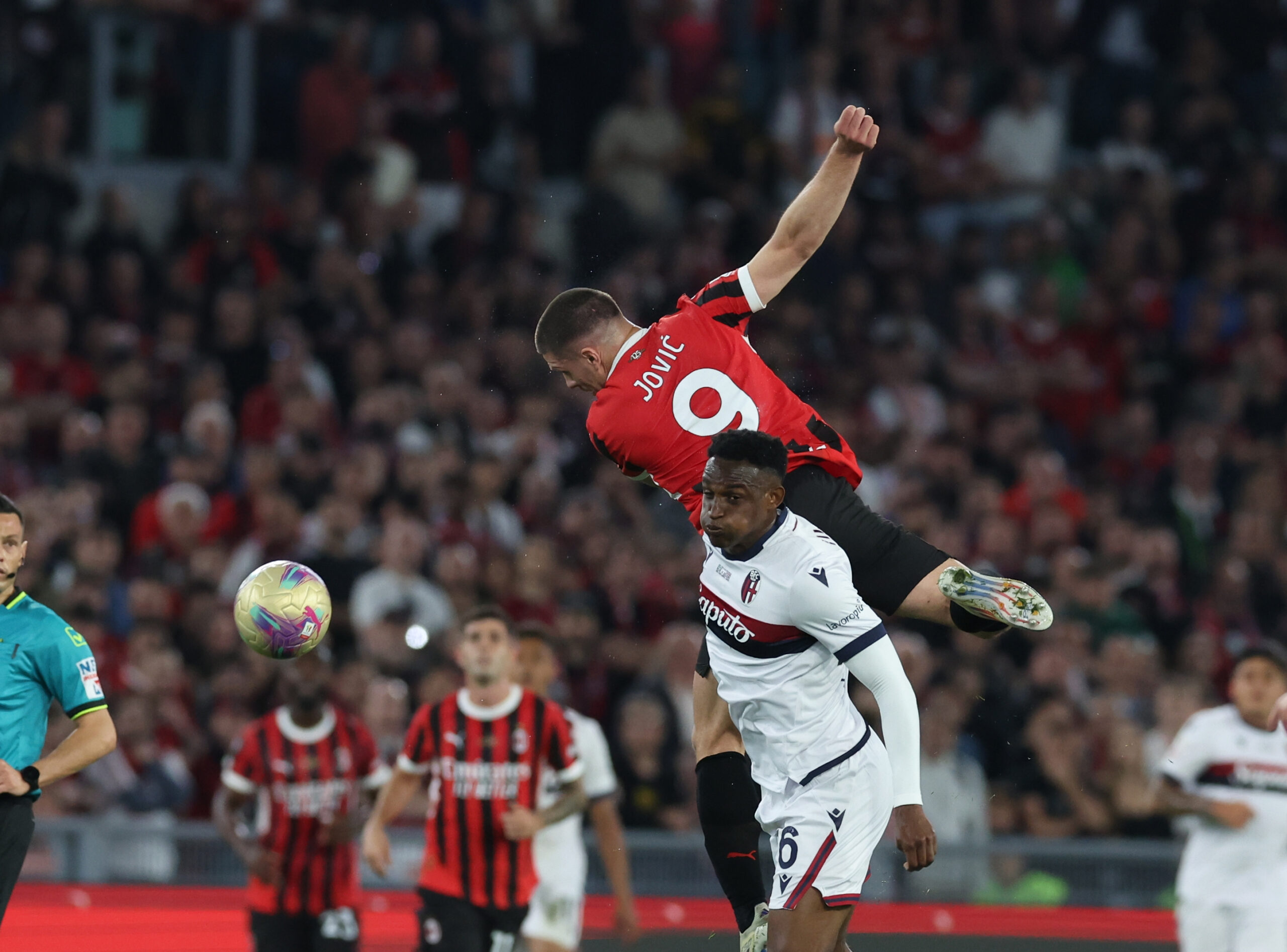 ROME, ITALY - MAY 14: Luka Jovic of AC Milan in action during the Coppa Italia Final match between AC Milan and Bologna at Stadio Olimpico on May 14, 2025 in Rome, Italy. (Photo by Claudio Villa/AC Milan via Getty Images)
