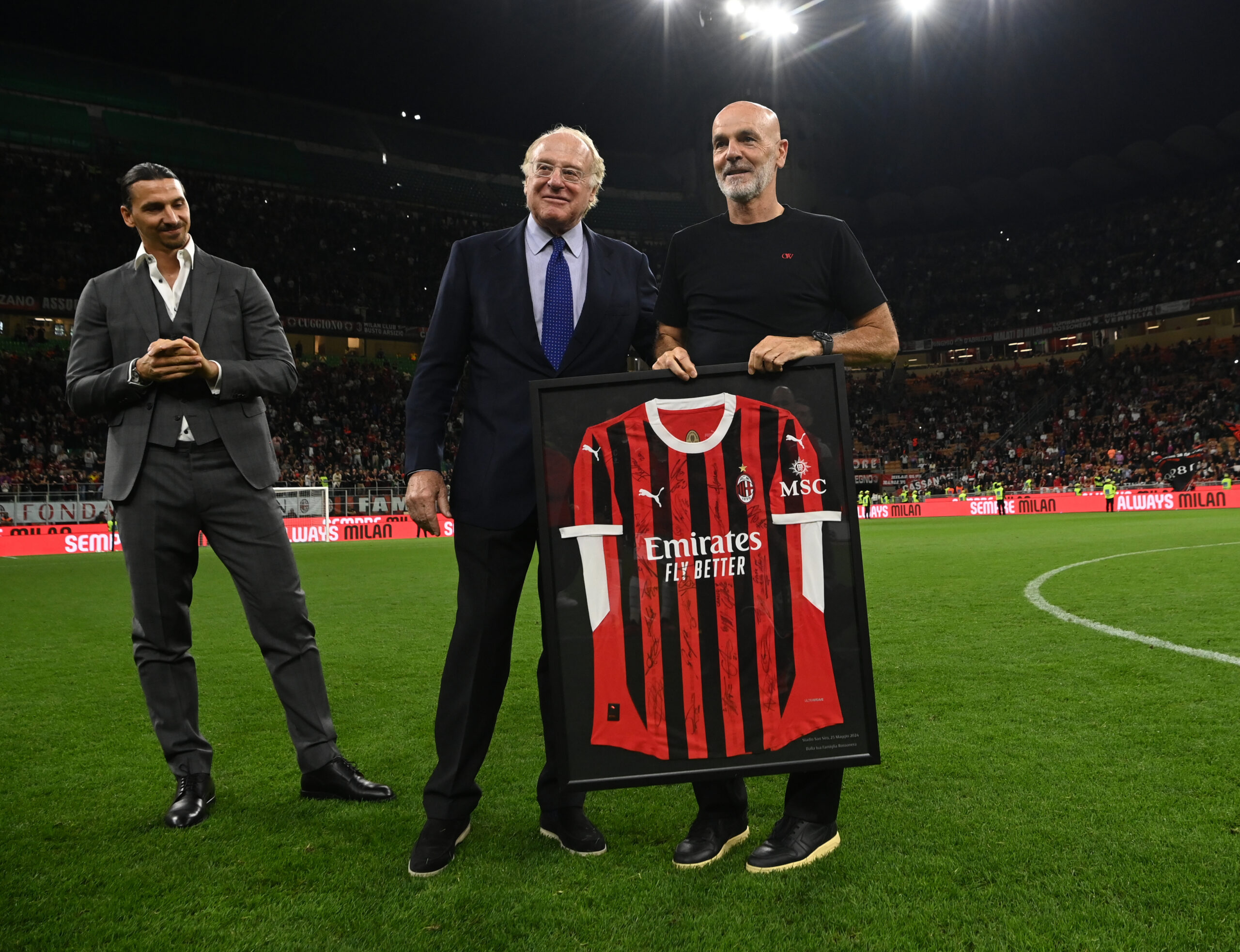 MILAN, ITALY - MAY 25: Head coach of AC Milan Stefano Pioli poses with Paolo Scaroni for his last match with AC Milan at the end of the Serie A TIM match between AC Milan and US Salernitana at Stadio Giuseppe Meazza on May 25, 2024 in Milan, Italy. (Photo by Claudio Villa/AC Milan via Getty Images)
