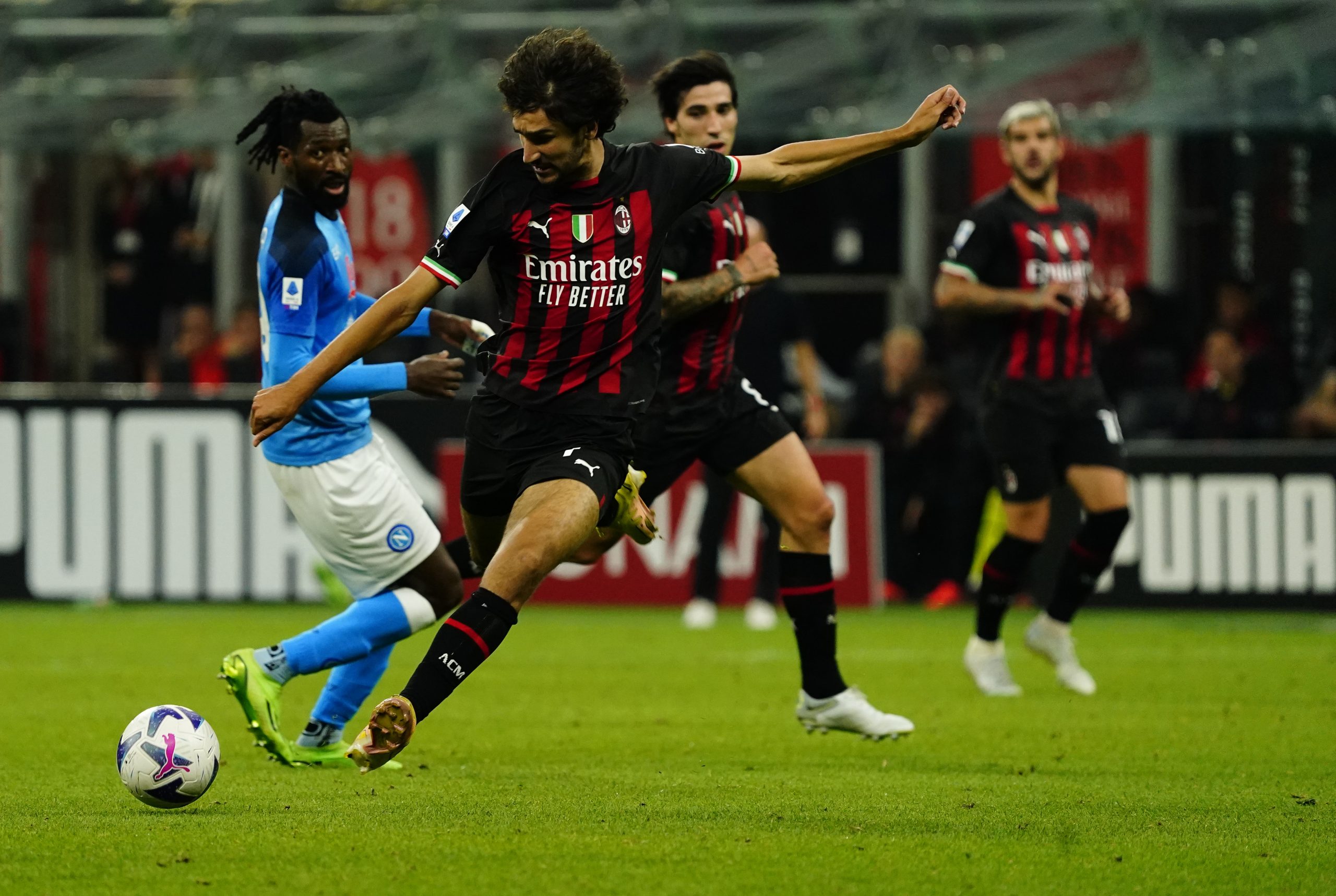 MILAN, ITALY - SEPTEMBER 18: Yacine Adli of AC Milan kicks the ball during the Serie A match between AC MIlan and SSC Napoli at Stadio Giuseppe Meazza on September 18, 2022 in Milan, Italy. (Photo by Pier Marco Tacca/AC Milan via Getty Images)