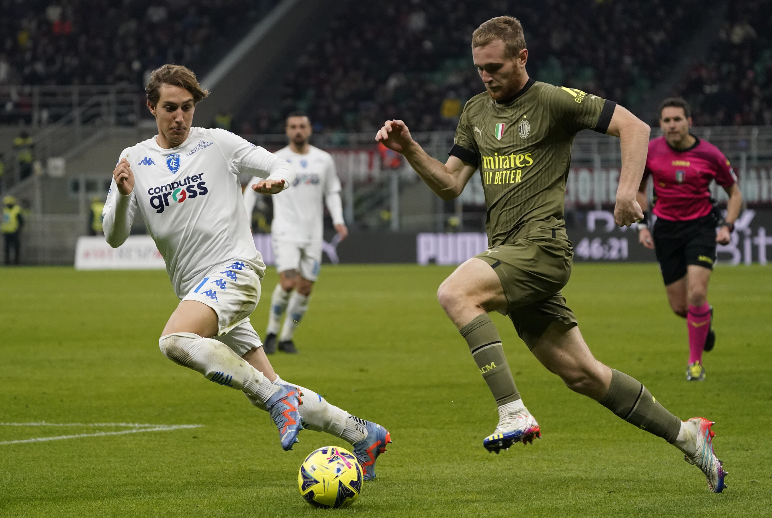 MILAN, ITALY - APRIL 07: Tommaso Pobega of AC Milan runs for the ball during the Serie A match between AC Milan and Empoli FC at Stadio Giuseppe Meazza on April 07, 2023 in Milan, Italy. (Photo by Pier Marco Tacca/AC Milan via Getty Images)
