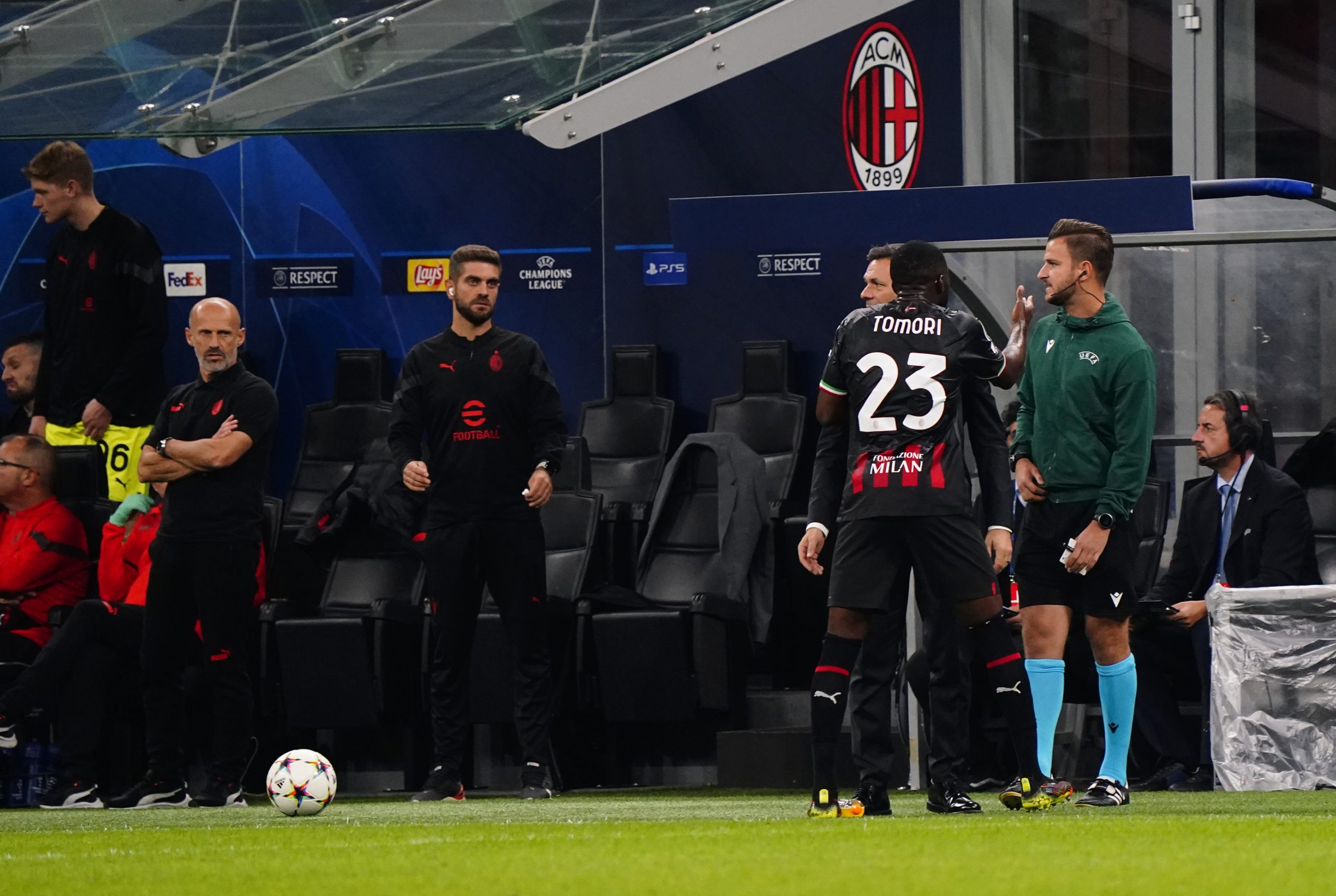 MILAN, ITALY - OCTOBER 11: Fikayo Tomori of AC Milan reacts with the linesmen during the UEFA Champions League group E match between AC Milan and Chelsea FC at Giuseppe Meazza Stadium on October 11, 2022 in Milan, Italy. (Photo by Pier Marco Tacca/AC Milan via Getty Images)