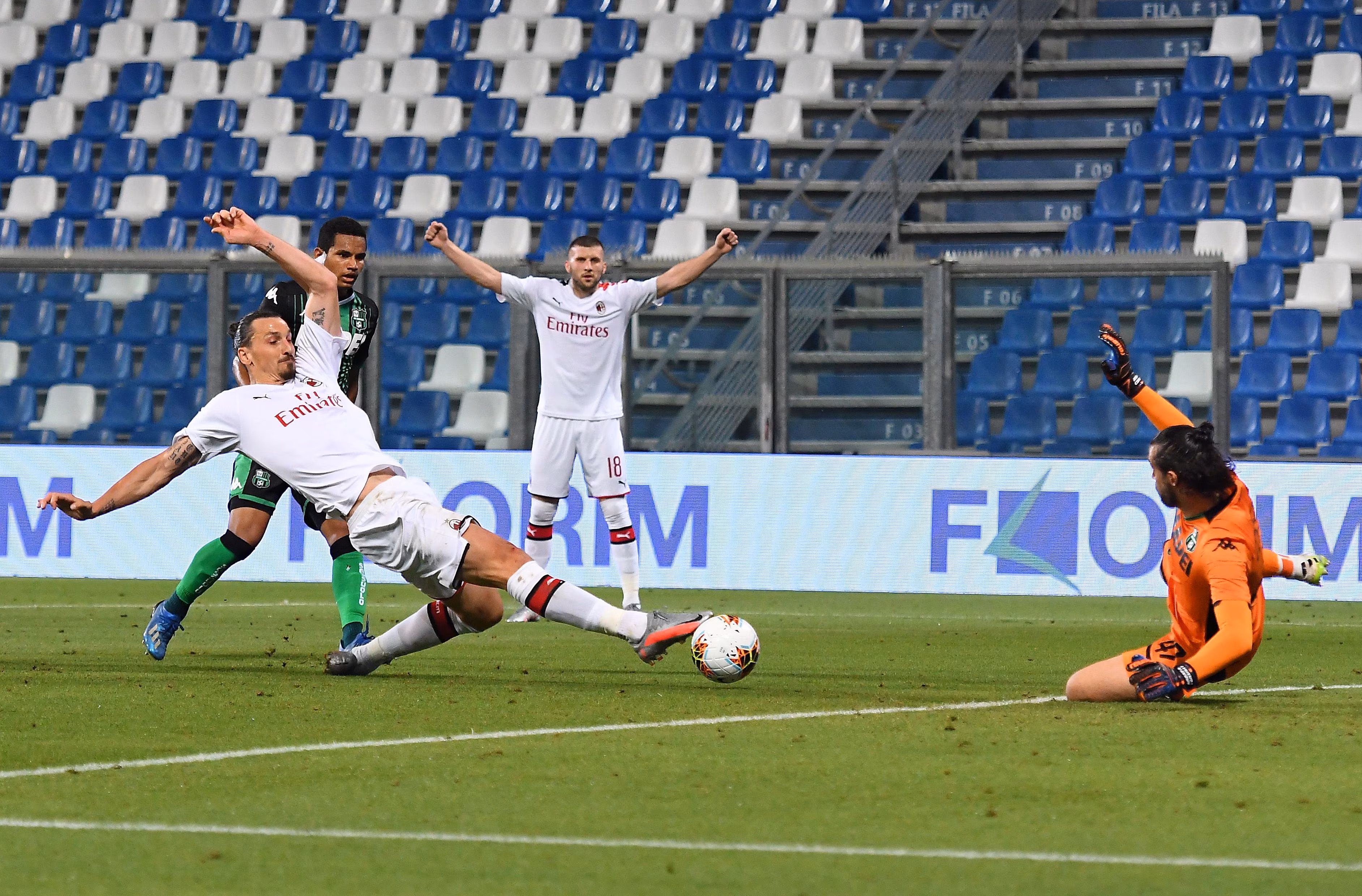 REGGIO NELL'EMILIA, ITALY - JULY 21: Zlatan Ibrahimovic of AC Milan misses a goal during the Serie A match between US Sassuolo and AC Milan at Mapei Stadium - Città del Tricolore on July 21, 2020 in Reggio nell'Emilia, Italy. (Photo by Alessandro Sabattini/Getty Images)
