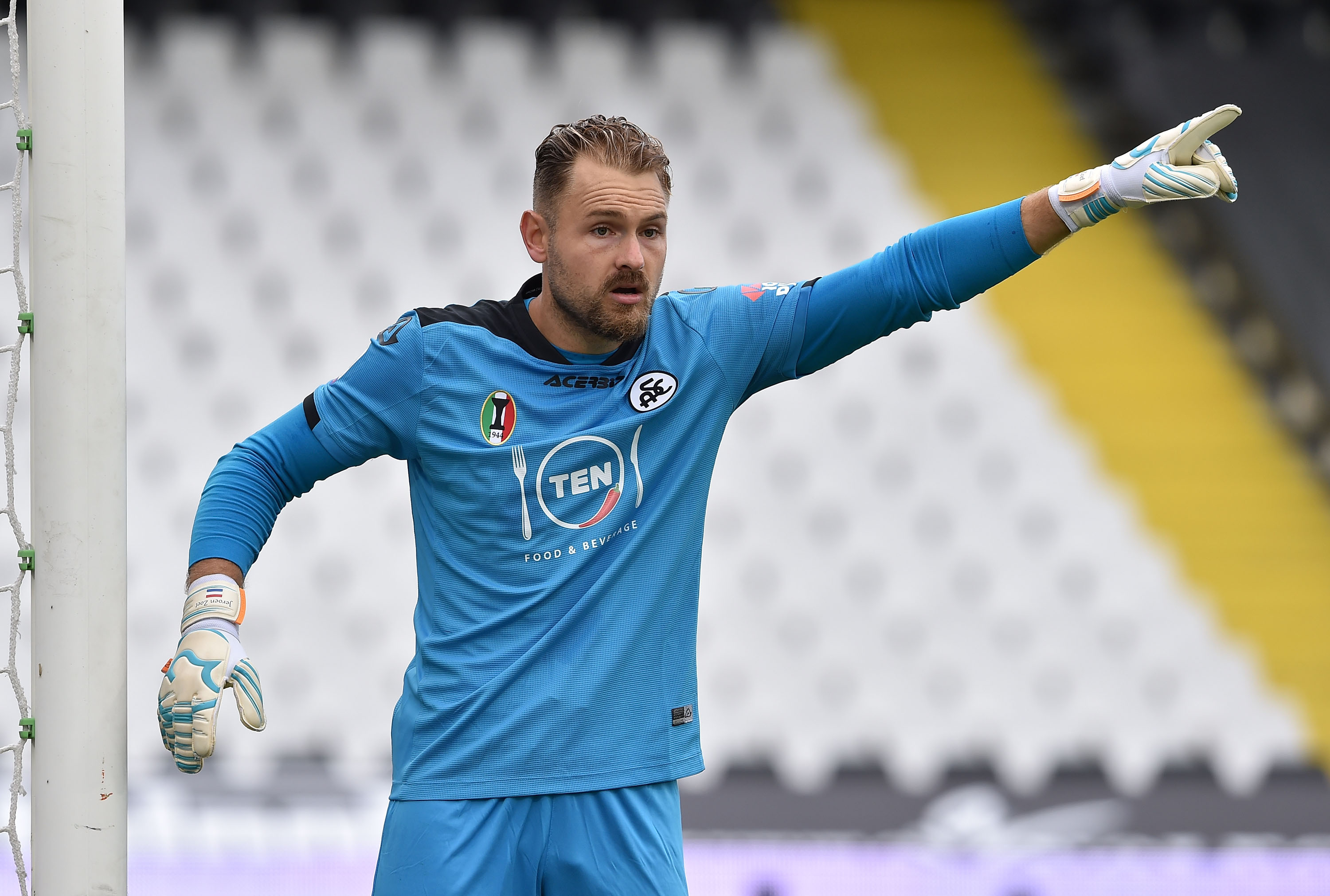 CESENA, ITALY - SEPTEMBER 27: Jeroen Zoet of Spezia Calcio gestures during the Serie A match between Spezia Calcio and US Sassuolo at Dino Manuzzi Stadium on September 27, 2020 in Cesena, Italy. (Photo by Giuseppe Bellini/Getty Images)
