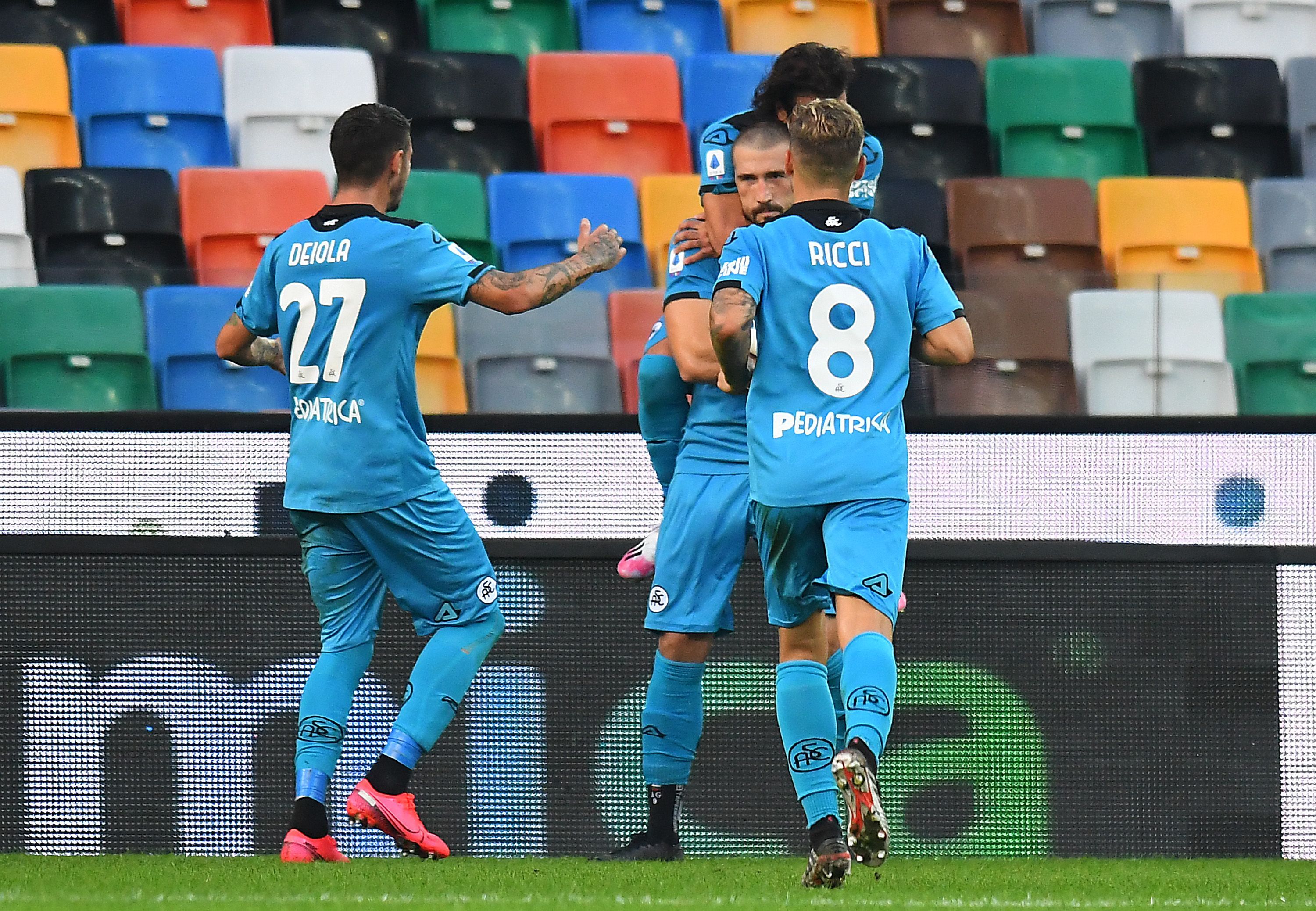 UDINE, ITALY - SEPTEMBER 30: Andrey Galabinov of Spezia Calcio celebrates after scoring the opening goal during the Serie A match between Udinese Calcio and Spezia Calcio at Dacia Arena on September 30, 2020 in Udine, Italy. (Photo by Alessandro Sabattini/Getty Images)