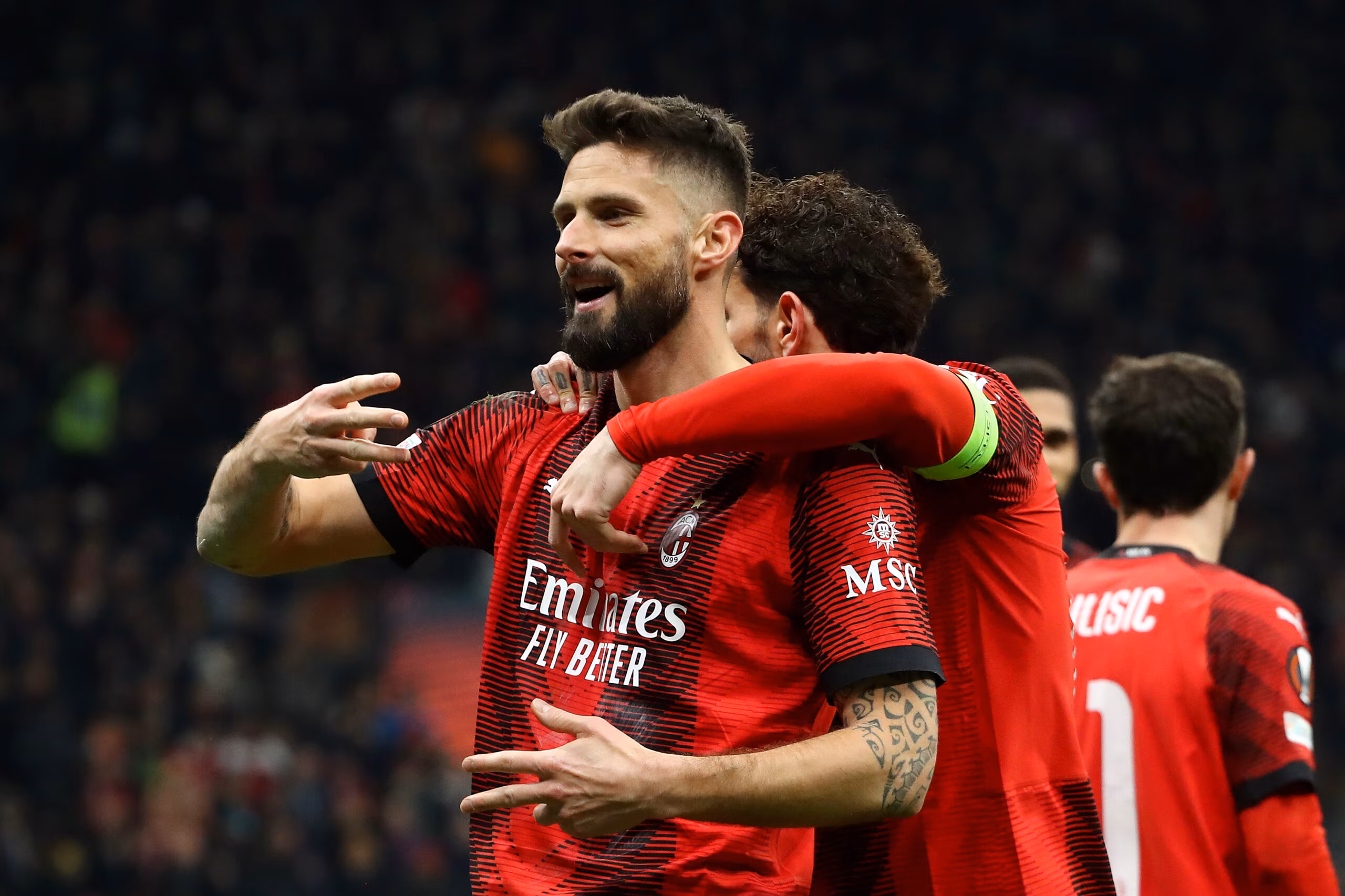 MILAN, ITALY - MARCH 07: Olivier Giroud of AC Milan celebrates scoring his team's first goal during the UEFA Europa League 2023/24 round of 16 first leg match between AC Milan and Slavia Praha at Stadio Giuseppe Meazza on March 07, 2024 in Milan, Italy. (Photo by Marco Luzzani/Getty Images)