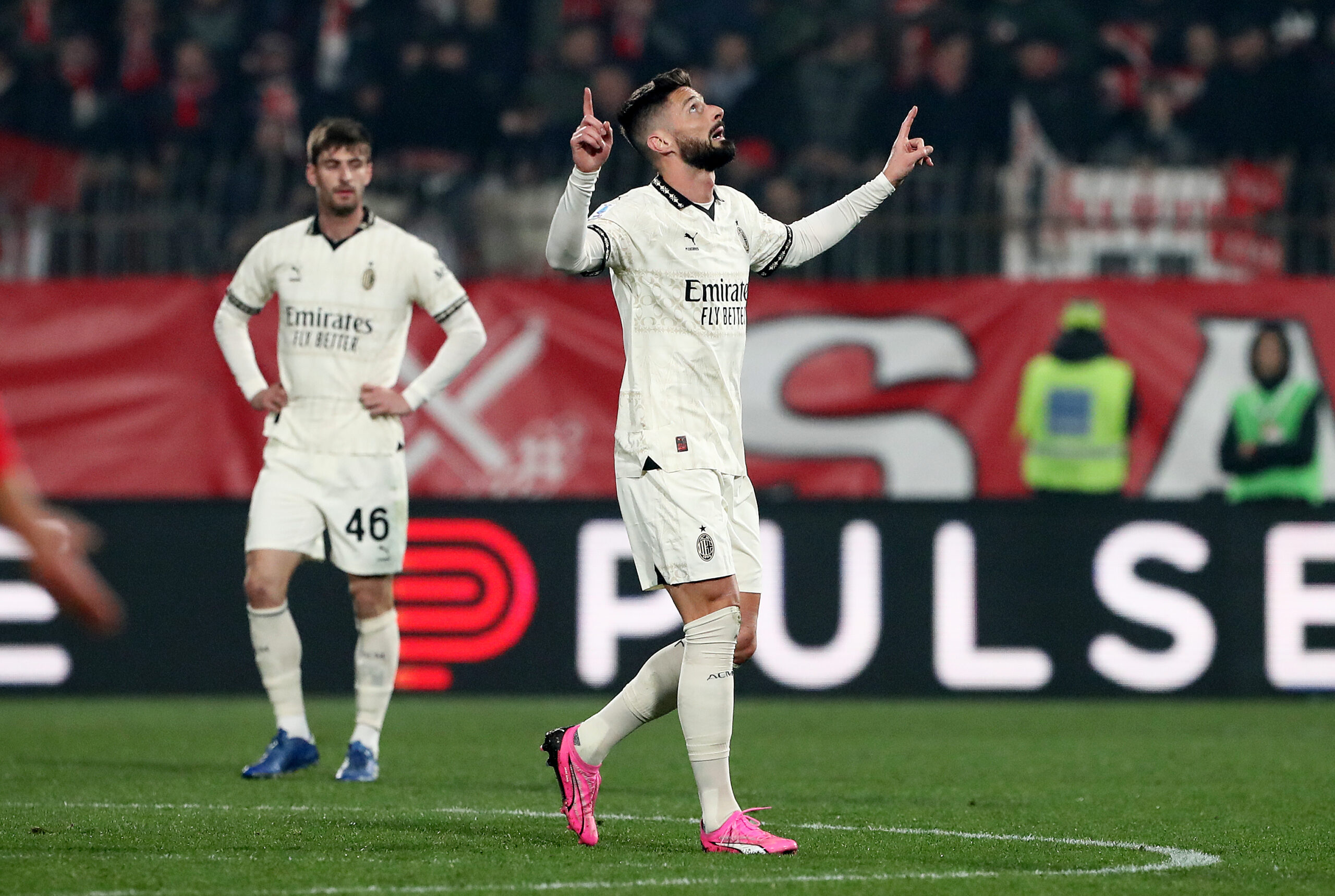 MONZA, ITALY - FEBRUARY 18: Olivier Giroud of AC Milan celebrates scoring his team's first goal during the Serie A TIM match between AC Monza and AC Milan - Serie A TIM at U-Power Stadium on February 18, 2024 in Monza, Italy. (Photo by Marco Luzzani/Getty Images)
