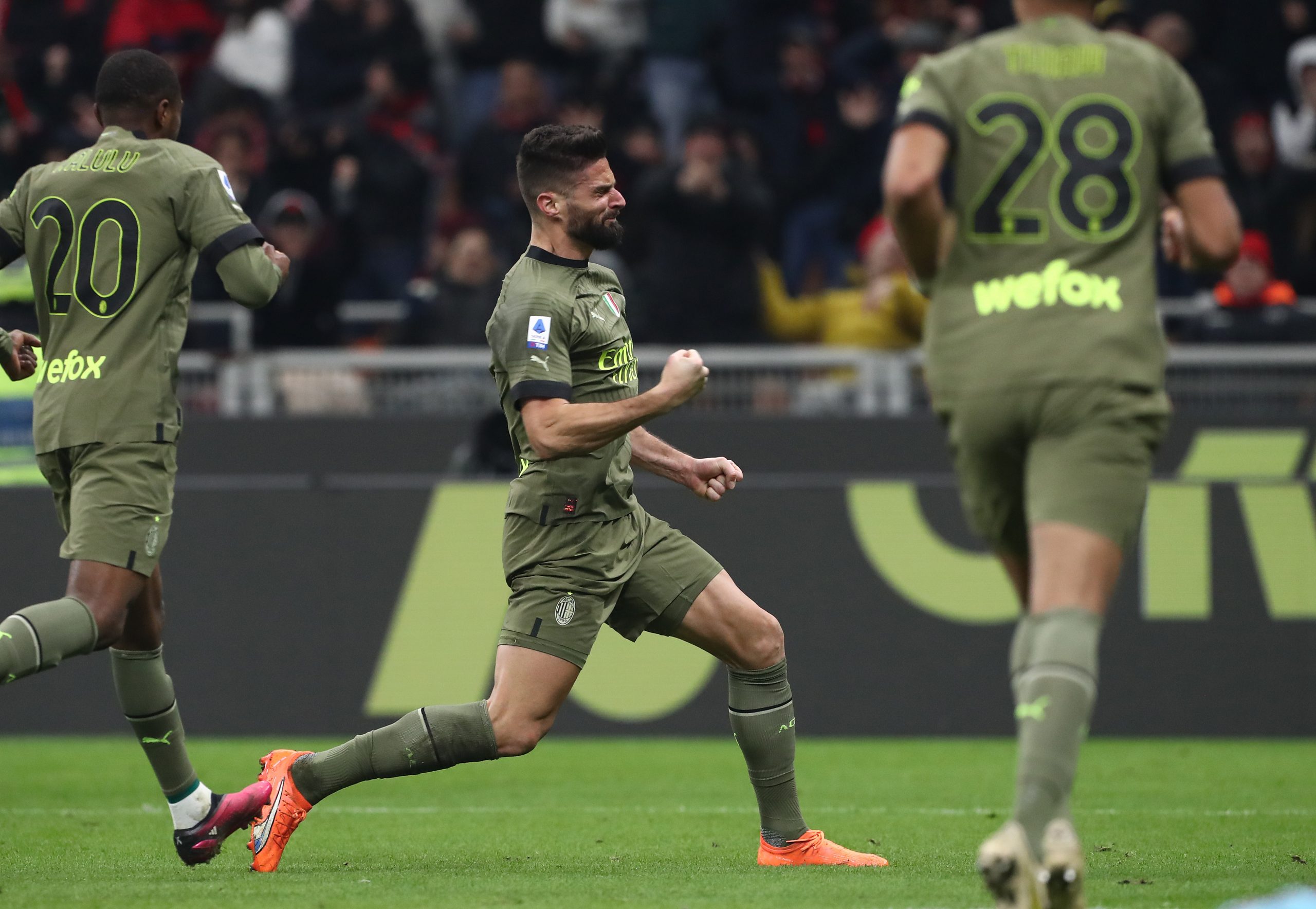 MILAN, ITALY - FEBRUARY 10: Olivier Giroud of AC Milan celebrates scoring his goal during the Serie A match between AC MIlan and Torino FC at Stadio Giuseppe Meazza on February 10, 2023 in Milan, . (Photo by Marco Luzzani/Getty Images)